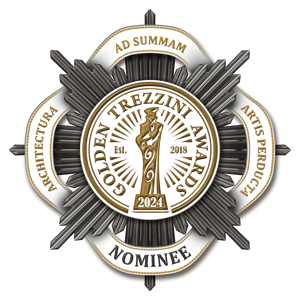 *Знак (эмблема) номинанта VII премии «Золотой Трезини» представляет собой изображение выпуклой серебряной восьмиконечной звезды с расходящимися полированными лучами-штралами. В центре звезды — круглый белый медальон с рельефным позолоченным изображением статуэтки «Золотой Трезини» с цифрами 2024 на постаменте и лучами, расходящимися от статуэтки по окружности. Слева от статуэтки буквы «Est.» (от Established, «основана») а справа - цифры «2018» (год основания премии). По окружности медальона расположена надпись рельефными золотыми буквами: «GOLDEN TREZZINI AWARDS». По окружности знака, на белой ленте-обруче с золотой окантовкой, пропущенной через лучи-штралы, начертан девиз золотыми буквами на латыни: «Architectura ad summam artis perducta» («Архитектура, устремленная к вершинам искусства»), в нижней части ленты приведена надпись черным шрифтом: «NOMINEE».