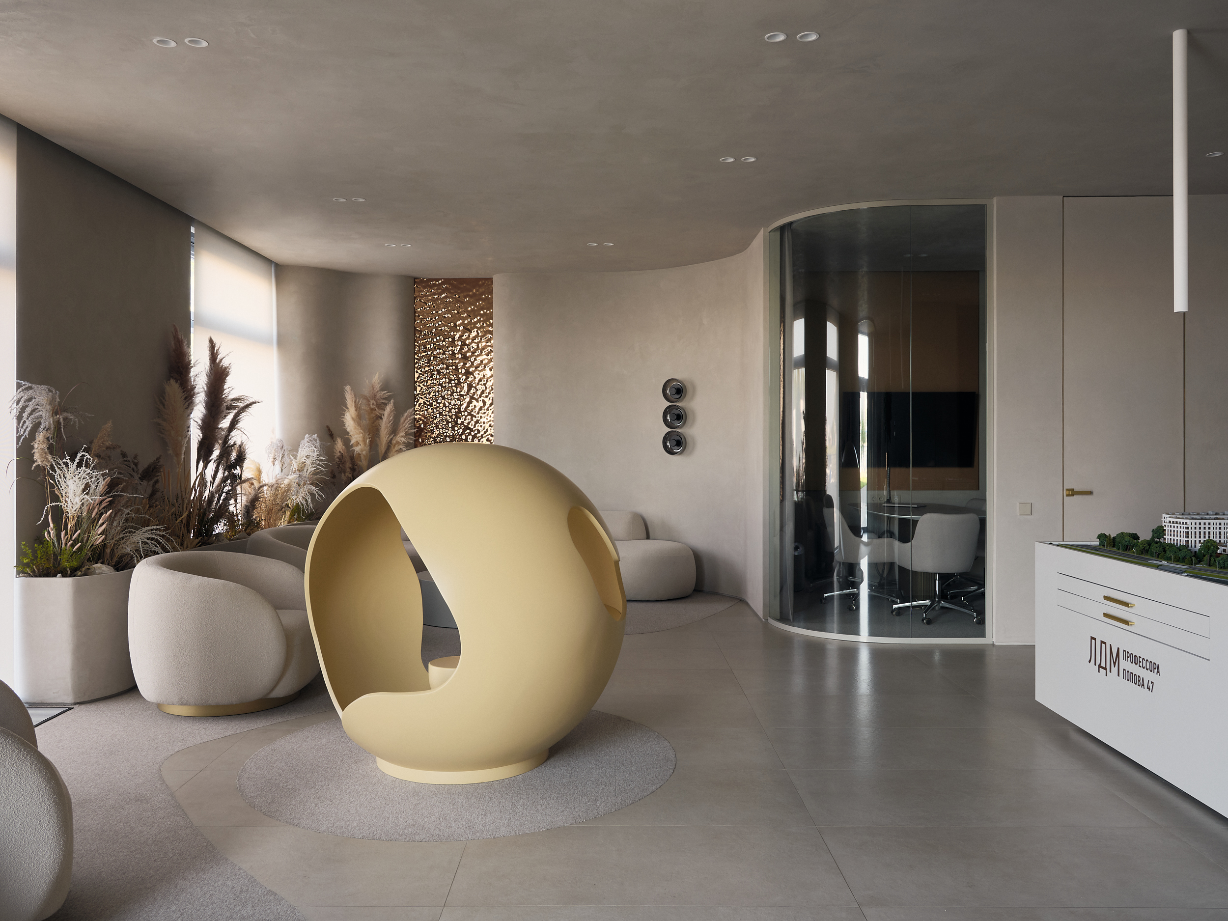 Custom design elements — a children’s sphere made of natural materials, a bio fireplace, a tree integrated into the reception desk, bespoke furniture, and gold metal inlays — create emotional and visual focal points, highlighting the brand’s core values: care for family, home, and the future. The space combines aesthetics, technology, and emotional engagement, resulting in a unique and memorable interior.