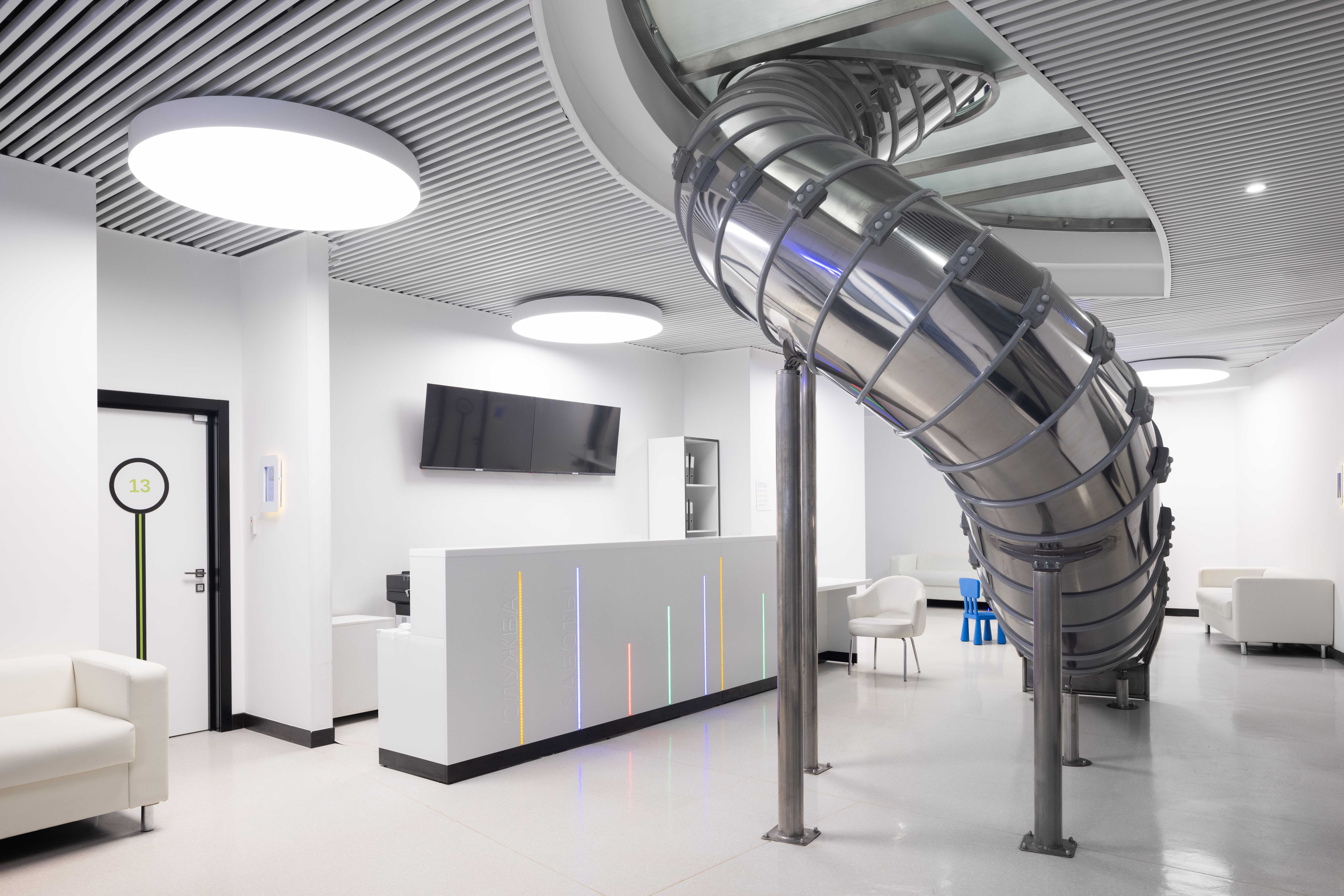 This is an interior design project for a private children’s health center called DocDeti, merging together futuristic elements and monochromic solemn color palette.