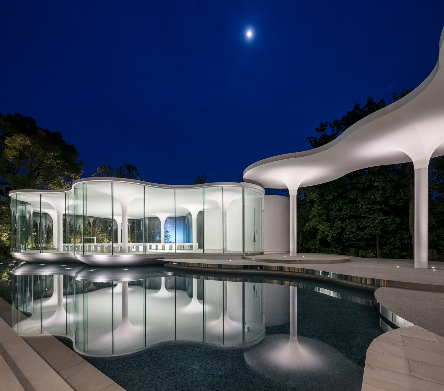 The cloud shaped chapel was enveloped in transparent curved glass bringing daylight from all directions and opens to the garden and the water basin. A minimalistic ceiling free of any technical pieces of machinery or equipment is supported by round columns with a hyperbolic cone head. The plan is composed by circles of 5m diameters put together at a 5m pitch for the approach and 6m inside the Chapel. The circles on the basin side has a hyperbolic shaped base, creating an impression of a floating chapel. The water surface reflects the floating chapel adding more lightness to the structure and extending the dreams into other dimensions.