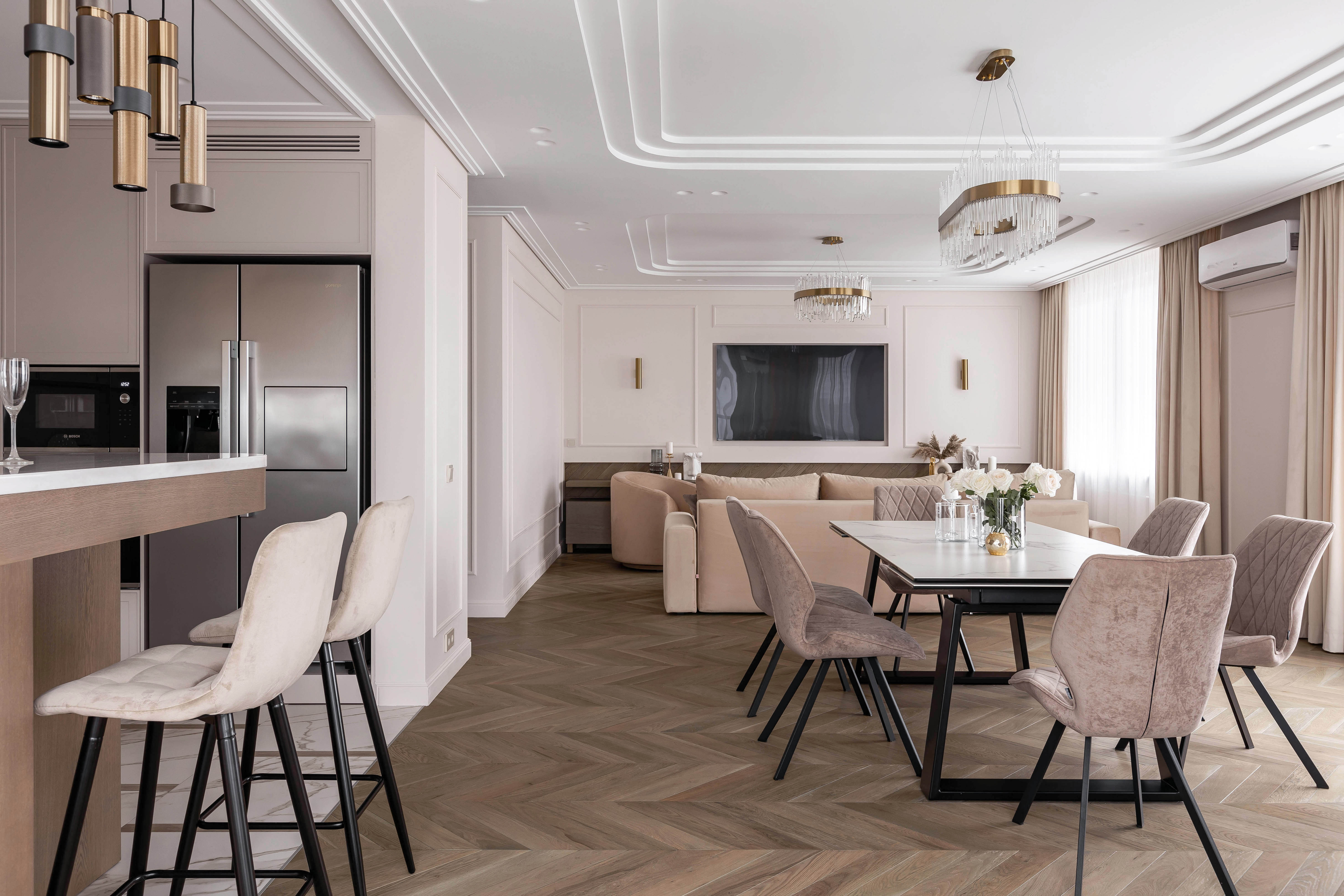 About the project (provided by the applicant) The interior was designed for newlyweds with a traditional worldview. An atmosphere of comfort was created, combined with classical rigor in a contemporary interpretation, featuring flowing spaces without unnecessary partitions or doors. The spacious living room accommodates a large number of guests and is zoned for three different types of activities. Lighting, furniture, and ceiling niches are designed in a bionic style with smooth, rounded corners. Accents of brass lighting and “gold” decor create compositional highlights.