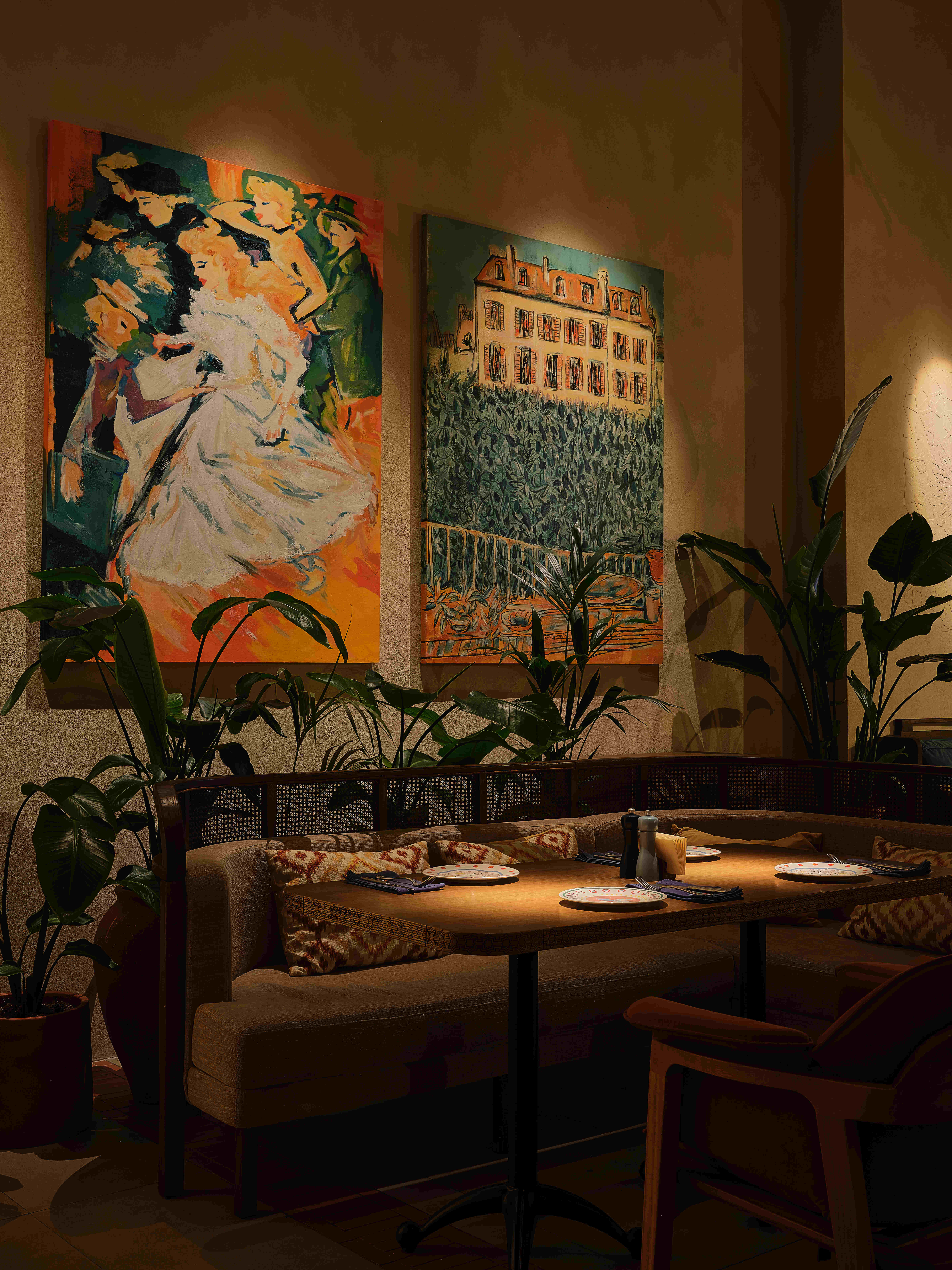 The interior is executed in natural shades with handcrafted ceramics and mosaics. Eastern ornaments and arches create a mysterious atmosphere, while vibrant ceramics on the counters add character. Soft lighting fills the space with warmth and coziness.
