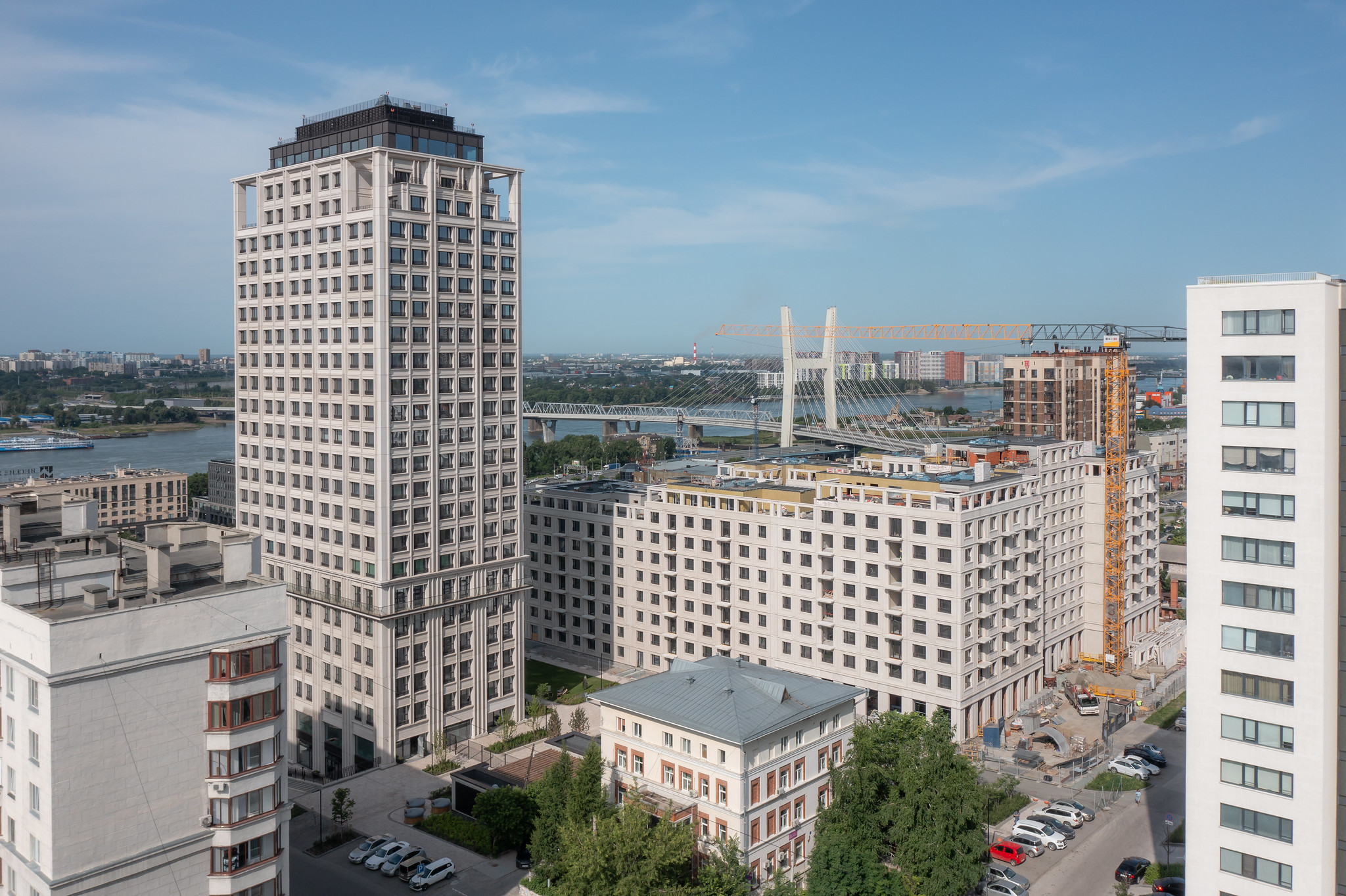 Na Dekabristov Quarter is a residential district in the center of Novosibirsk. Its architectural landmark is a tower with an urban garden and a view of the river. The design is based on the principles of neoclassicism with an emphasis on simplicity of form and laconic décor. The architects used a strict façade with a regular grid in a calm beige-gray color scheme. All elements are arranged symmetrically and repeated.