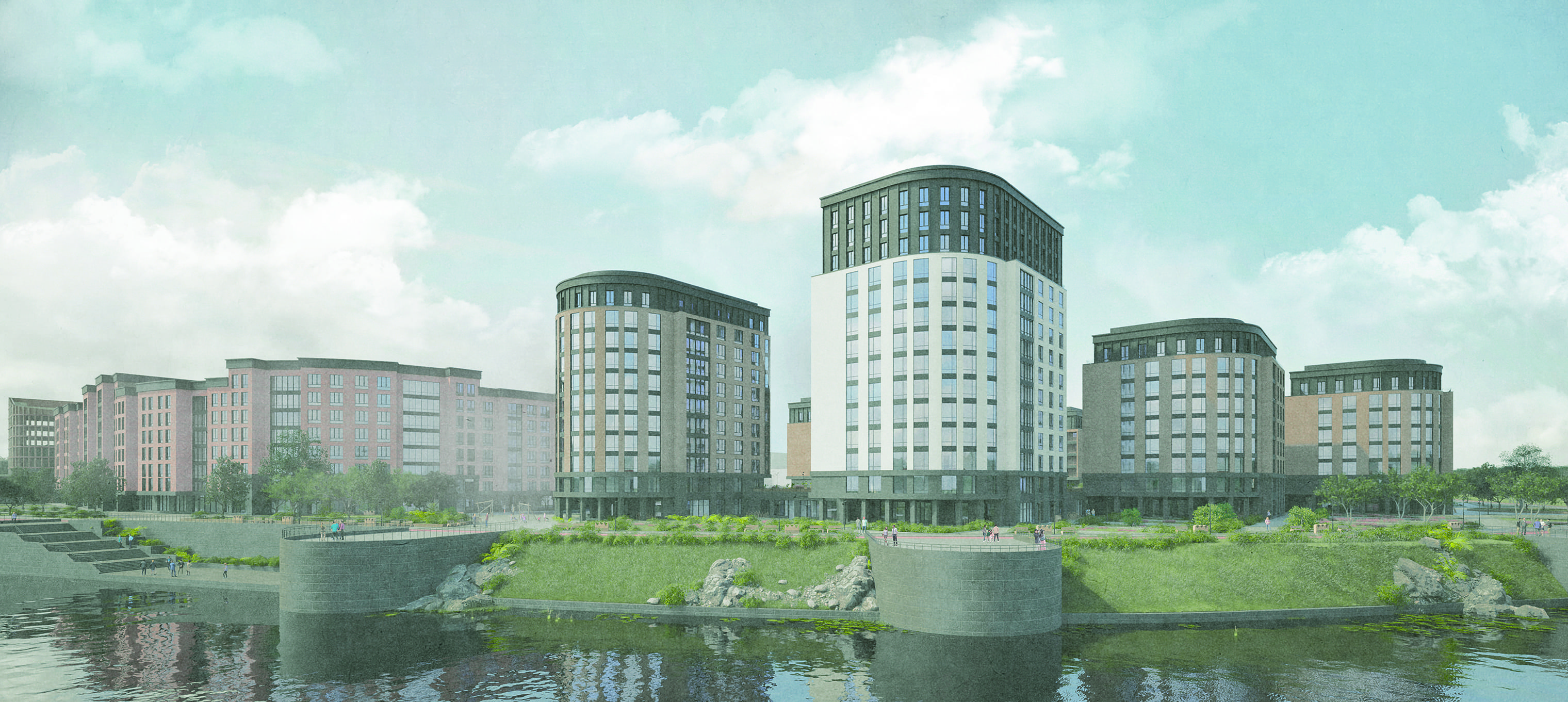 About the project (provided by the applicant) The residential complex project was developed as part of the planning of a quarter on the banks of the Okhta River in Saint Petersburg. It focuses on the comprehensive development of the territory in accordance with current regulatory requirements. The architectural appearance of the complex is based on a unified façade concept along the embankment, taking into account the identity of the district and sunlight exposure requirements.