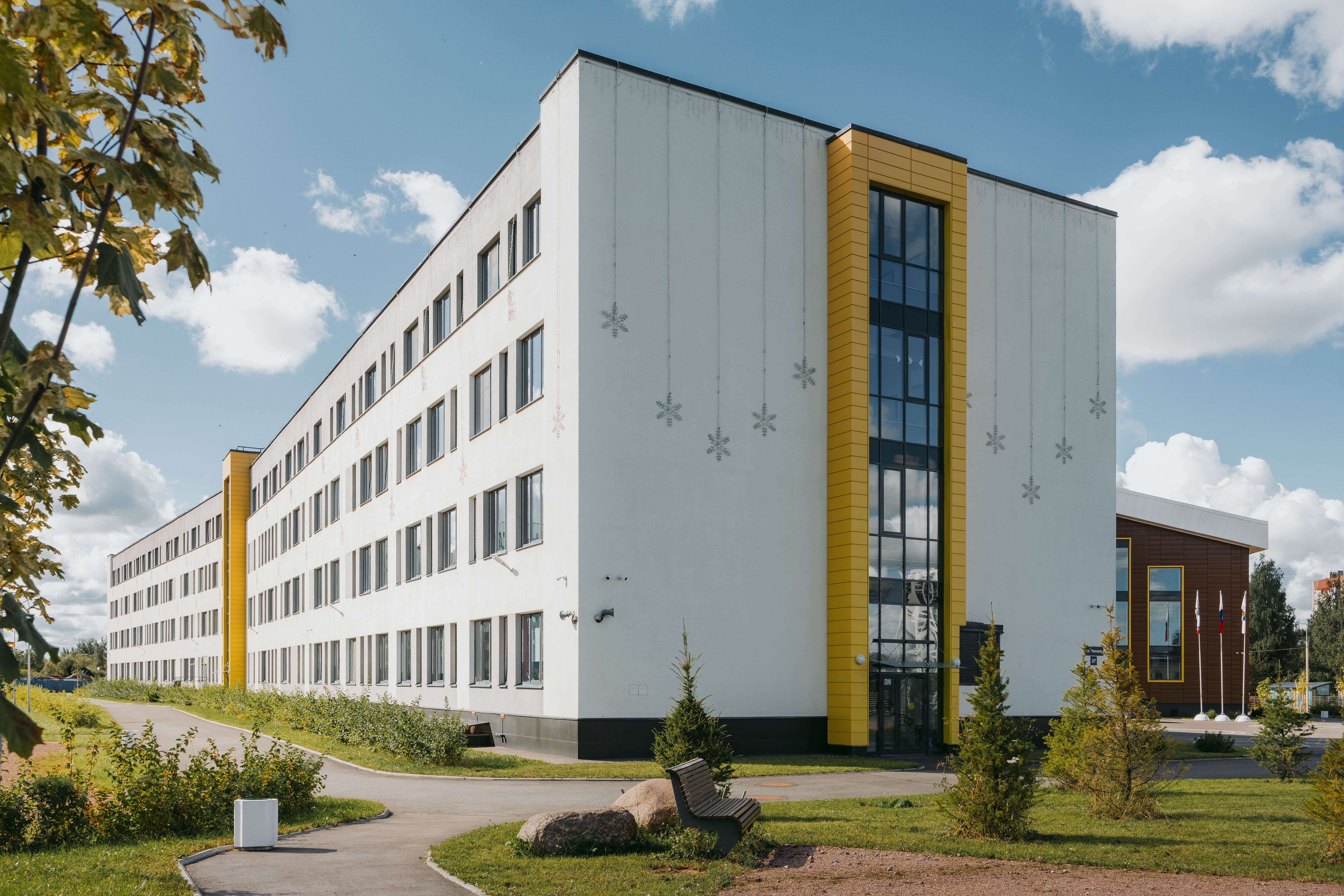 The school is located in Gatchina and features a radial layout. Three blocks—the primary school, the main school, and the sports core—radiate from a central atrium, forming a characteristic Y-shaped structure.