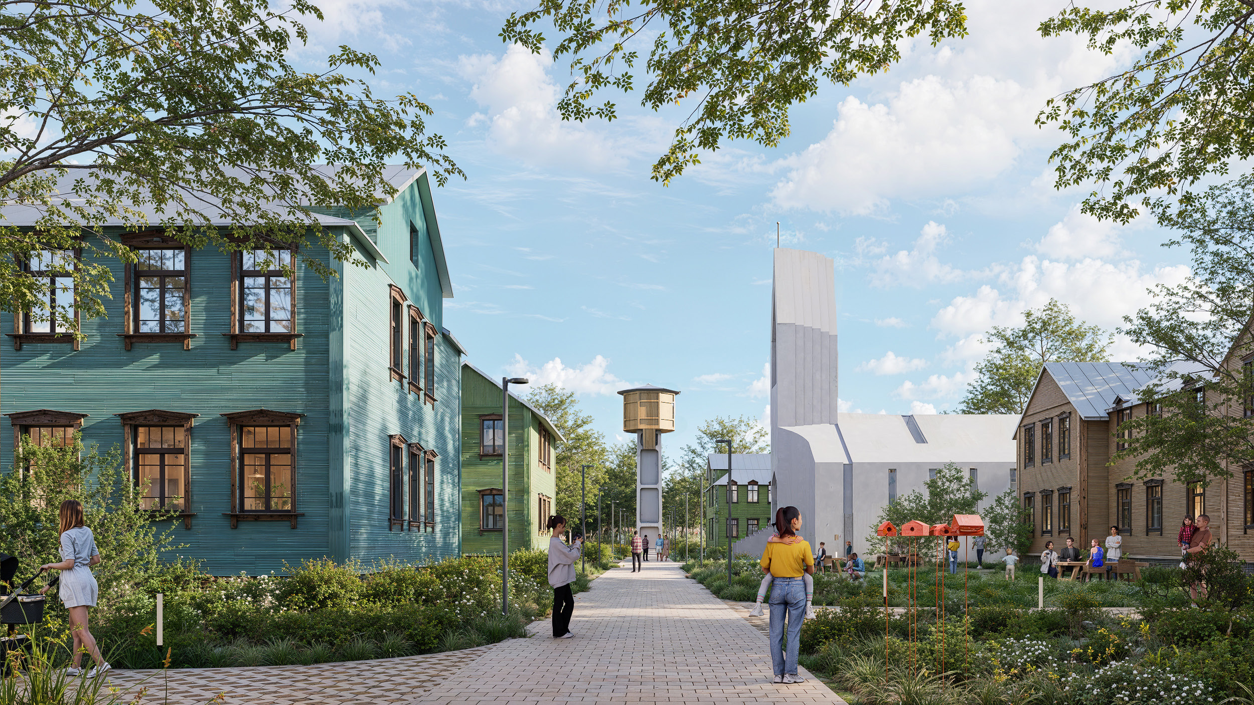 The revitalization project aims to breathe new life into the quarter: facades along the avenue will host commercial spaces, while residential buildings with front gardens will appear deeper within the block—a revival of a long-forgotten housing format for the city. The historical landmark, the water tower, will be restored, and a new Catholic church will be constructed. Nearby, taller modern buildings will harmonize in silhouette with the historic surroundings.