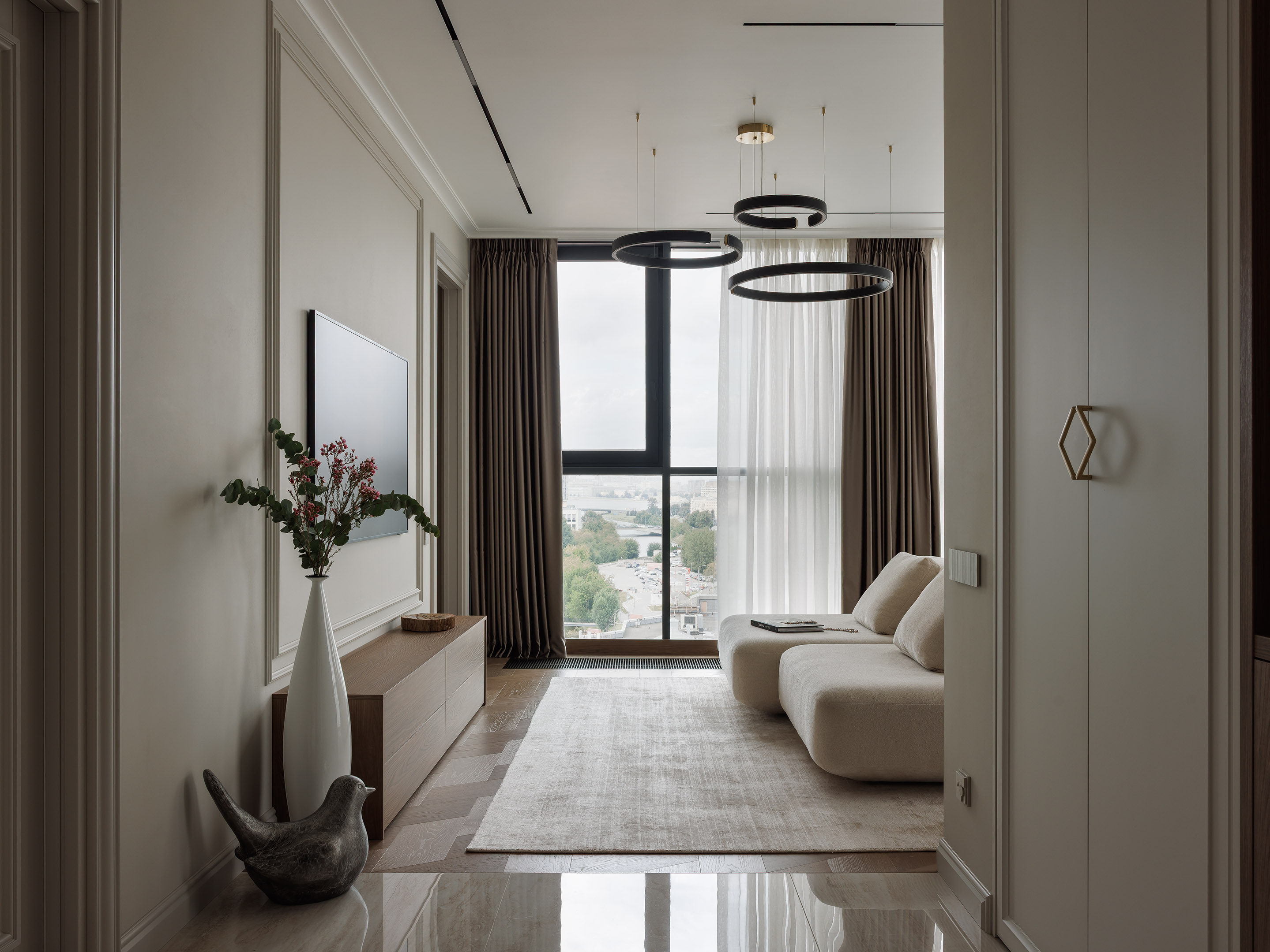 About the project (provided by the applicant) The project “Silver Bird” was created in the residential complex “Alter,” located near the historic center of Saint Petersburg. Upon opening the door, one can enjoy a bird’s-eye view of the textured Shipbuilding Plant building, the calm waters of the Okhta River, and the Smolny Cathedral. The project received its name not only due to the spectacular views but also in honor of the apartment owner — a beautiful young woman, a businesswoman in the tourism industry. In the home office, a desk made of quartzite with marble inclusions was designed to resemble the sunlit, silvered ocean with islands, as seen from a porthole window.