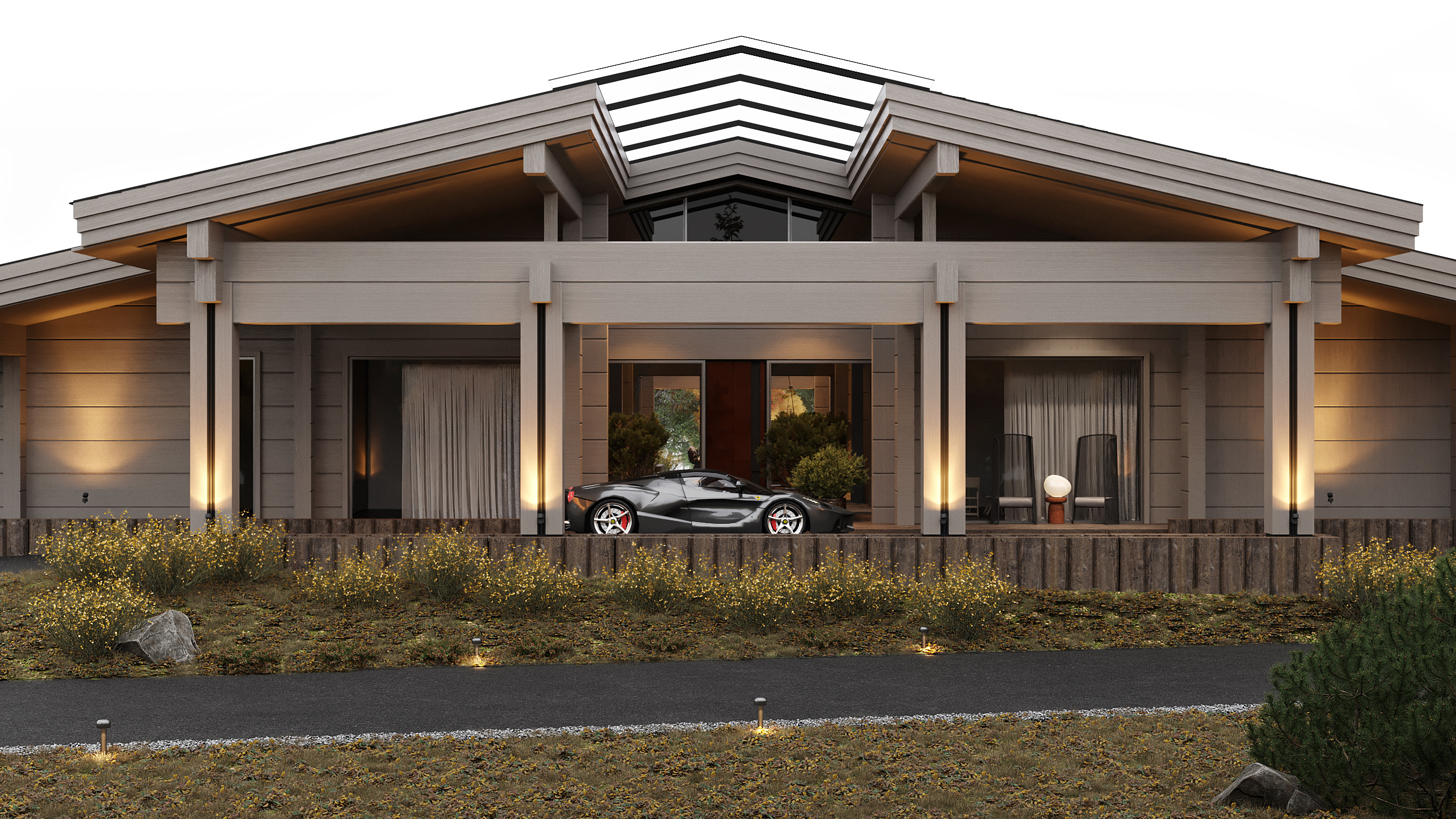 About the project (provided by the applicant) This private residence of 650 sq. m. is a part of an out-of-town estate that occupies the area of 5 hectares. This proposal includes detailed design of the premises with a private shoreline and a variety of functions. The house has traditional shape and a typical V-roof, and comprises a glass greenhouse. The main building material is LVL with irregular section — it is the cornerstone of both the exterior and the interior design.