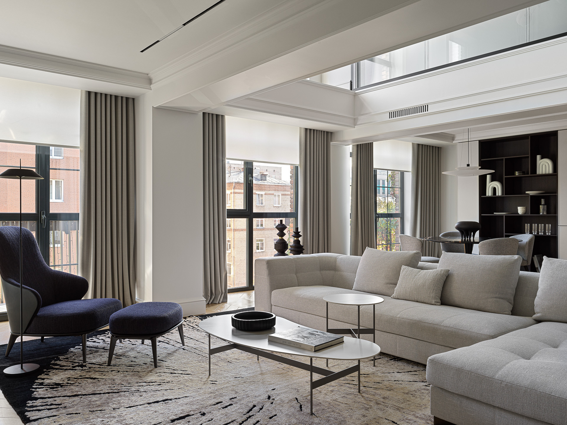 One standout feature is the impressive six-meter-high ceilings. The key solution was to create a second light and panoramic glazing, which helps to blur the boundaries between indoors and outdoors.