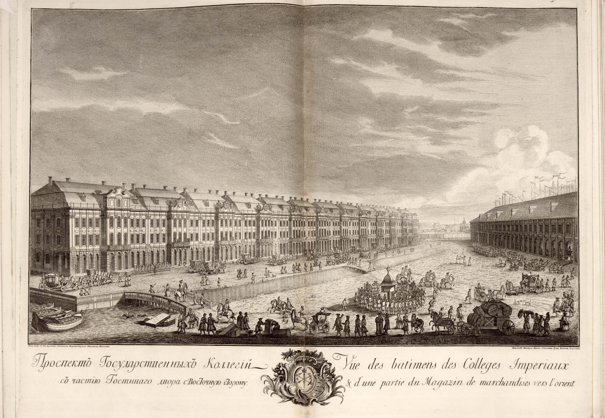 Илл.: Здание Двенадцати коллегий постройки Доменико Трезини. Гравюра Е.Т. Внукова (1750—1751) по рис. М. Махаева (1749—1750). «Проспект государственных коллегий с частью Гостиного двора с восточной стороны».