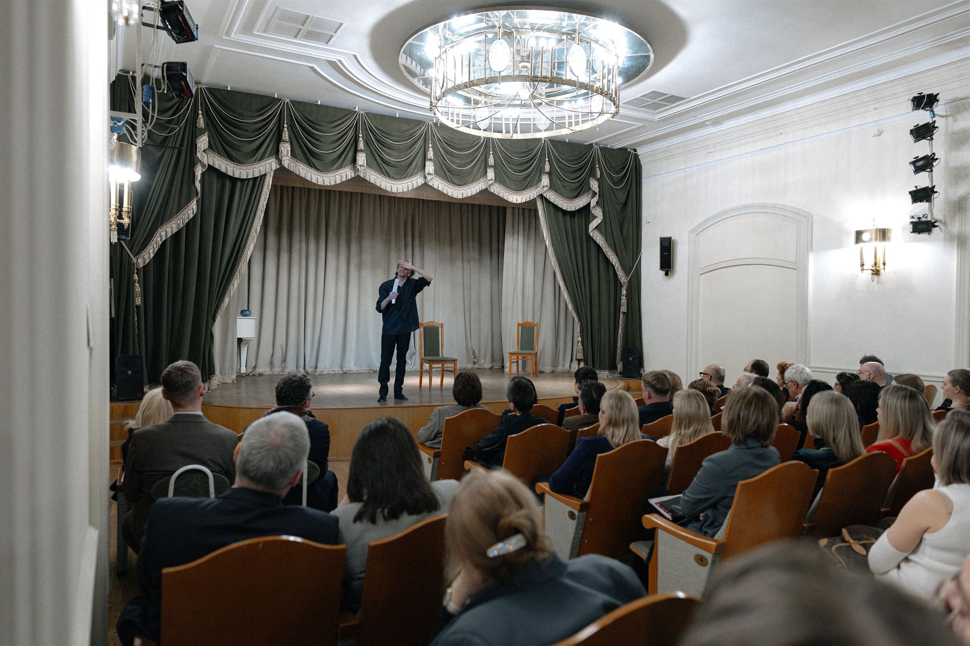 Вступительное слово президента Всероссийского музея А. С. Пушкина Сергея Некрасова, прозвучавшее после приветствий директора музея Ольги Корневой и основателя премии «Золотой Трезини» Павла Чернякова, задало вечеру неожиданную историческую перспективу. Впервые для широкой аудитории была проговорена поразительная деталь: задолго до строительства дома княгини Волконской, в котором снимал квартиру А. С. Пушкин, на этом самом участке жил Доменико Трезини — первый архитектор Санкт-Петербурга. Факт этот, известный специалистам, вне научной среды почти не осмыслен. Между тем, он позволяет взглянуть на значение этого места совершенно иначе: Пушкин провёл последние месяцы жизни там, где за столетие до него формировался ранний облик города. Этот уникальный синтез — когда история архитектуры становится не просто декорацией, а прологом к сценическому действу — создал атмосферу почти мистического ожидания.