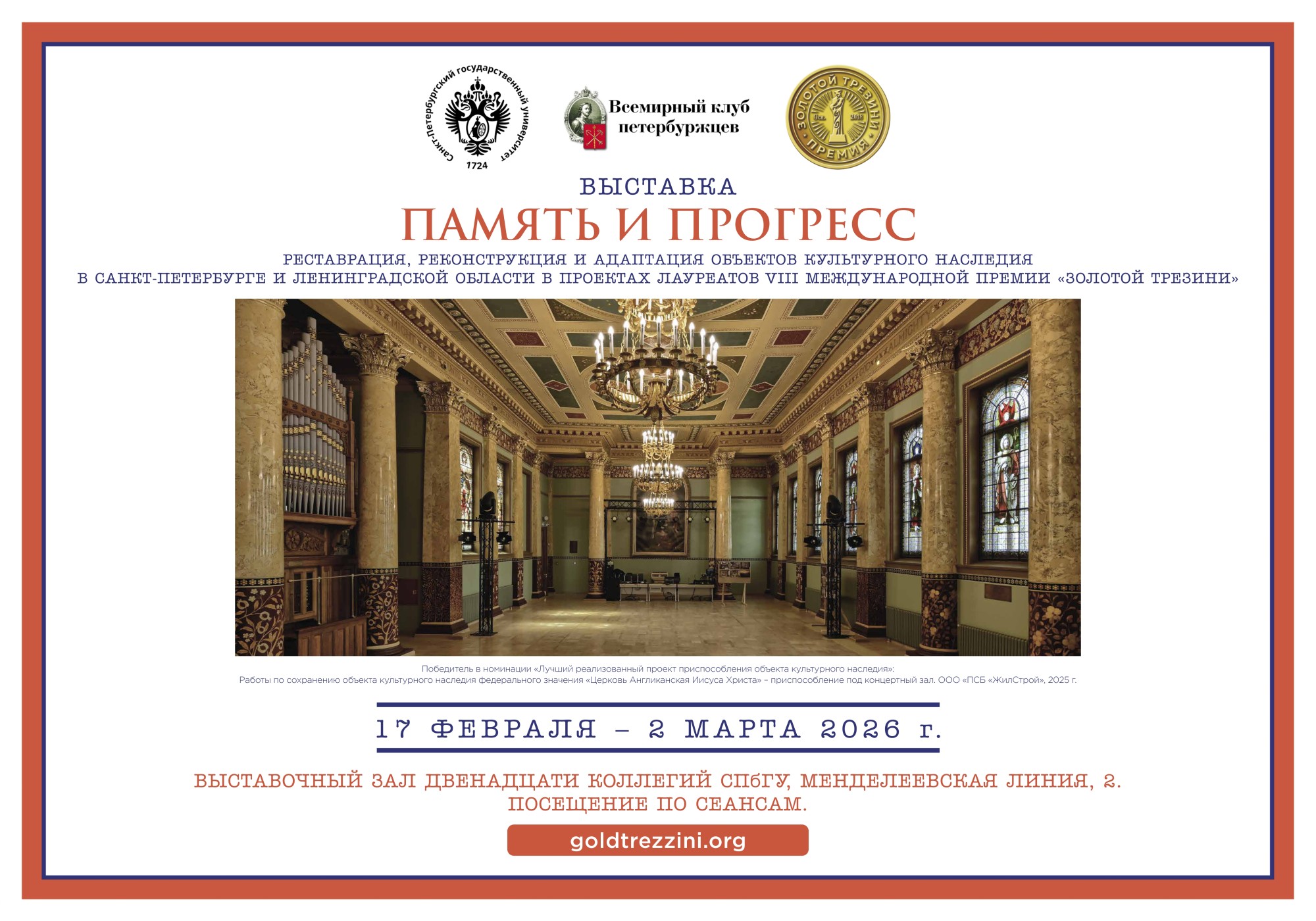 17 февраля 2026 года в выставочном зале здания Двенадцати коллегий Санкт-Петербургский государственный университет, Всемирный клуб петербуржцев и оргкомитет Международной премии «Золотой Трезини» откроют выставку «Память и прогресс».