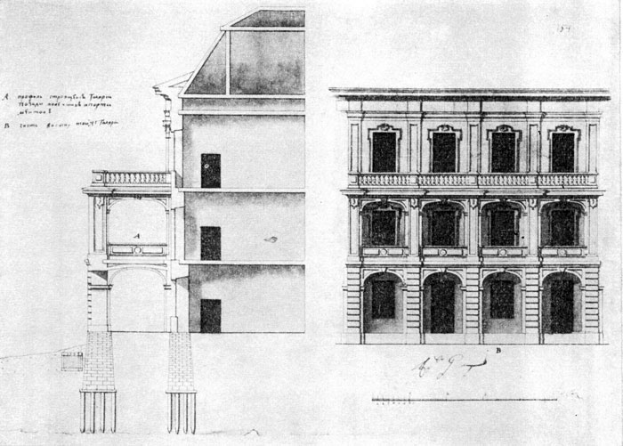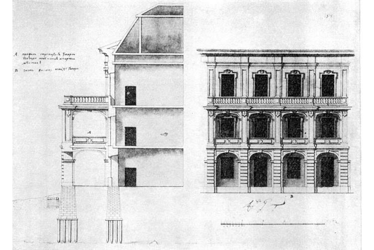 После смерти Доменико Трезини, с 1734 по 1756 год, Джузеппе Трезини служил архитектором в Коммерц-коллегии. Под его руководством было закончено здание гостиного двора на Васильевском острове (начатое еще учителем), в 1735–1736 гг. он строил складские помещения на острове на Малой Неве, а в 1741 году – склады для сала и смолы на Петровском острове [6]. Из всех реализованных проектов Джузеппе Трезини сохранились только западная галерея здания Двенадцати коллегий и Трехсвятительская церковь на Васильевском острове (рис. 8).