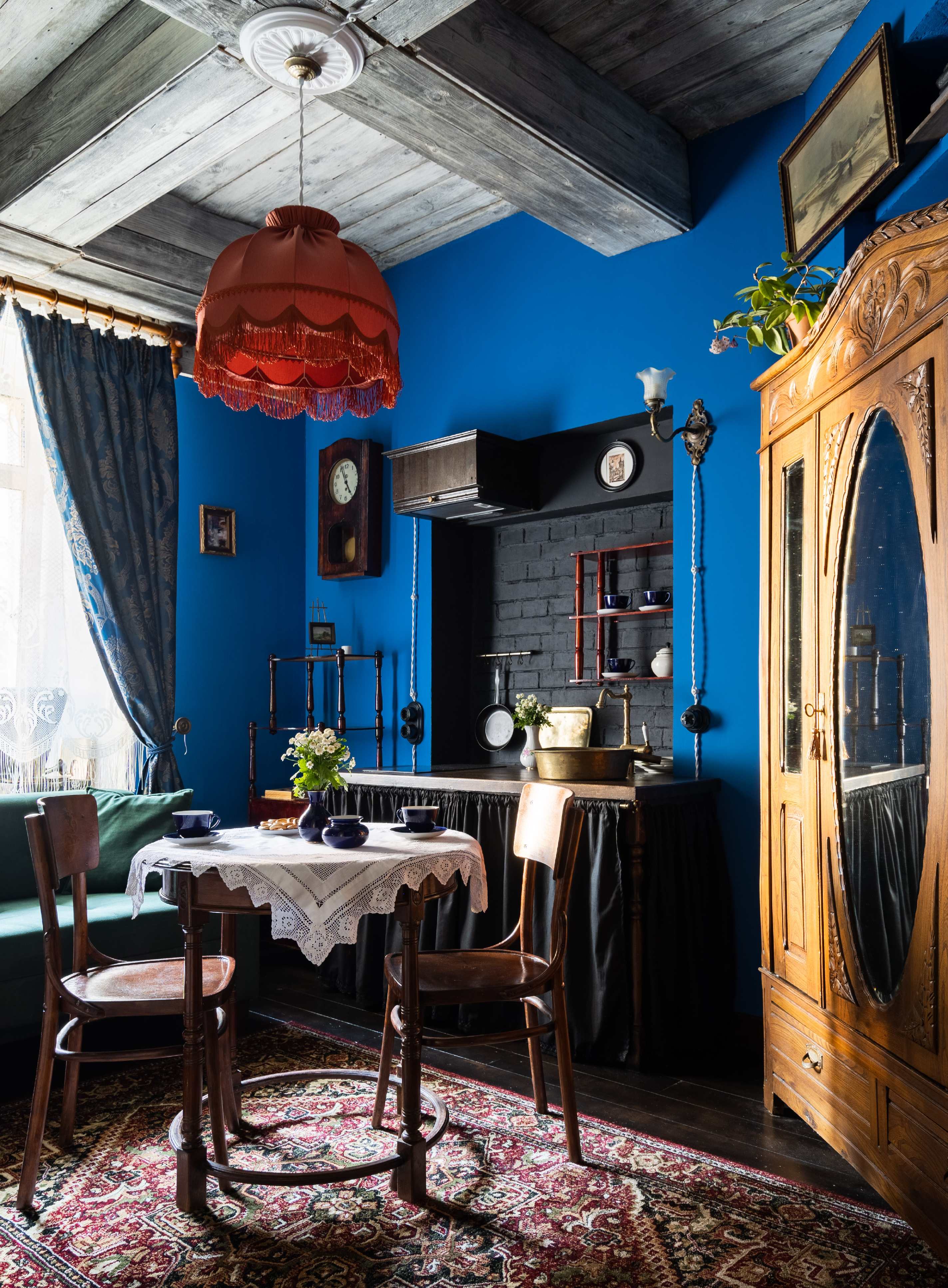 О проекте: Авторы проекта посчитали, что было бы неплохо вспомнить, как выглядел старый петербургский доходный дом, и снова сделать стиль а-ля-рюс популярным. Используемые элементы дизайна и мебель действительно могут перенести вас в прошлое. Темные оттенки и приглушенное освещение создают атмосферу вечера. Имитация русской печи, старинный зеркальный шкаф и кровать в старинном стиле четко отсылают к выбранному историческому периоду. Основной материал, использованный в данной конструкции, – натуральное дерево.