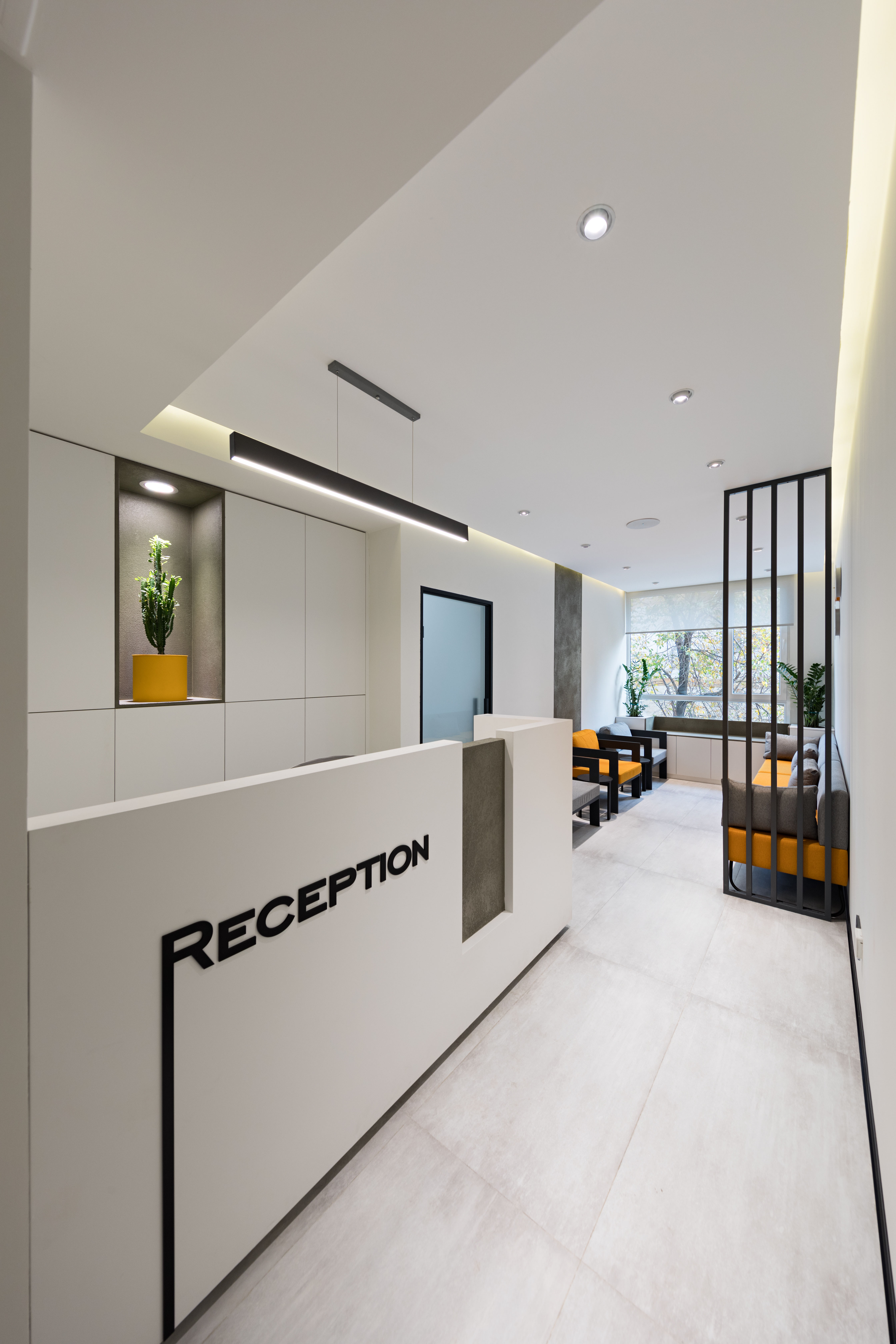 Клиника занимает не слишком большое здание, что ставило перед авторами проекта непростую задачу: разместить на ограниченной площади все необходимые помещения. Для интерьеров зон приема пациентов в качестве главного акцента был выбран оранжевый цвет, что помогло создать композиционное единство пространства.