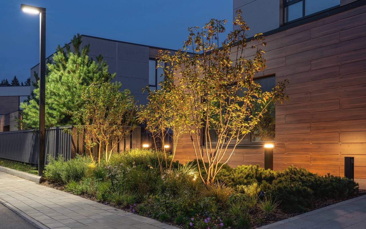 Мы подсветили входную группу дома, которая стала приветствием для всех гостей, и тщательно продумали освещение, чтобы дом и окружающие его растения гармонично сочетались, создавая поистине волшебную атмосферу. Некоторые деревья получили особое внимание — их подсветка подчеркивает красоту и текстуру коры, а сам дом мягко подсвечивается, словно окутываясь теплым светом. От входной группы плавно ведет красивая, подсвеченная дорожка, которая мягко направляет к островной зоне отдыха и другим уютным уголкам сада.