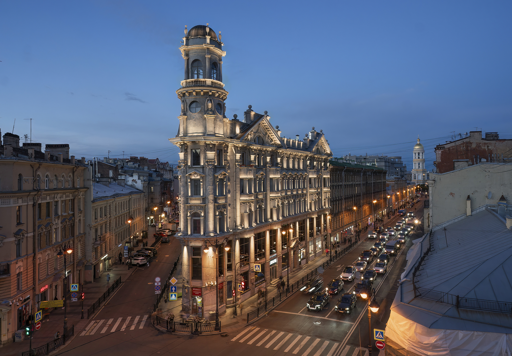 Подсветка не только выделяет архитектурные достоинства объекта, но и подчеркивает его роль в формировании уникального облика знакового перекрестка Санкт-Петербурга.