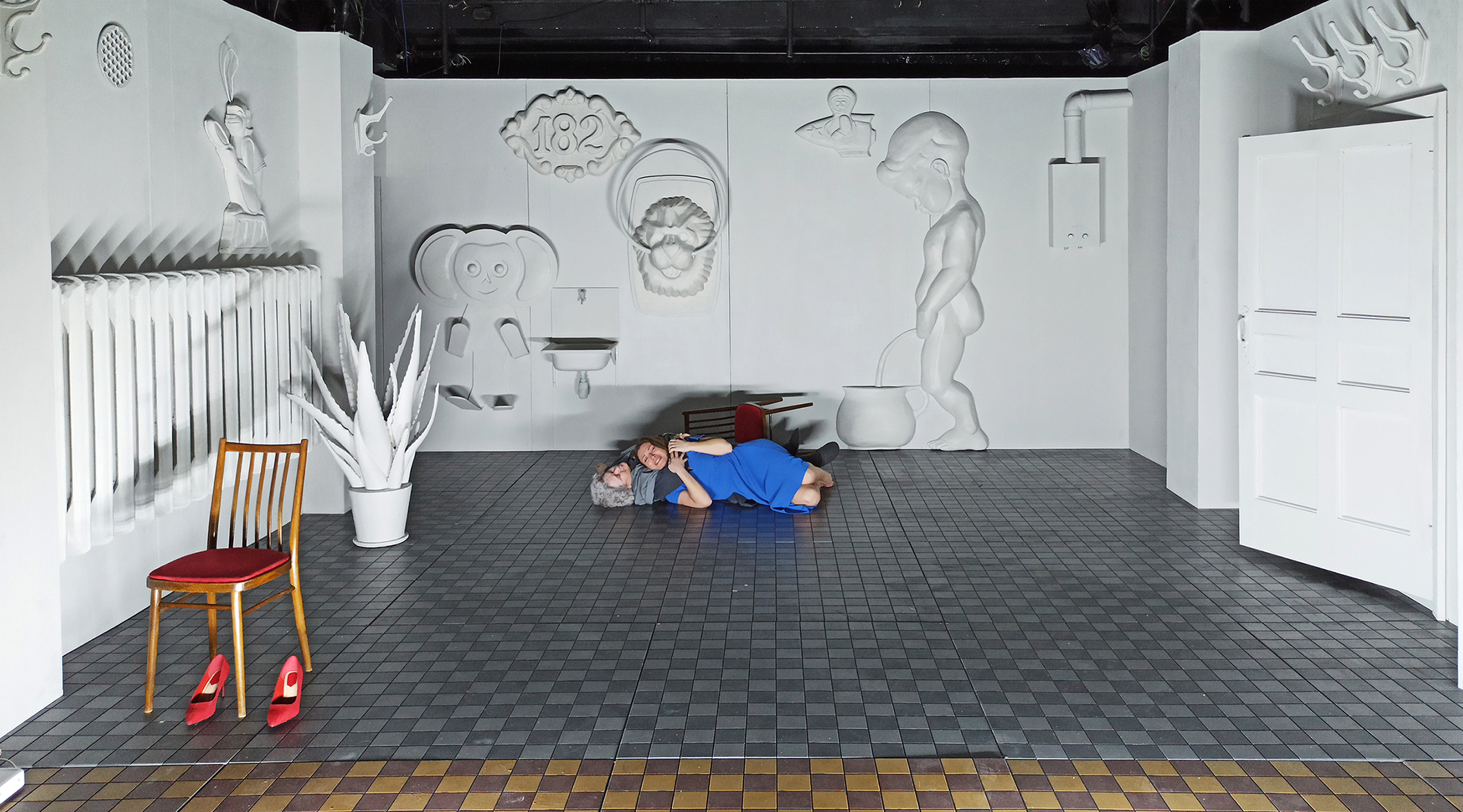 Сценографическое решение - это своеобразный "детский музей памяти". Бабушка главной героини восседает там, как смотрительница (хранительница) этого зала. Основная (игровая) часть пространства монохромна, как черно-белое фото, и только главная героиня является цветовой доминантой в этом мире флешбэков. Это мир человека с детскими травмами, комплексами вины, одиночеством и попыткой найти взаимопонимание с самим собой и со своими близкими.