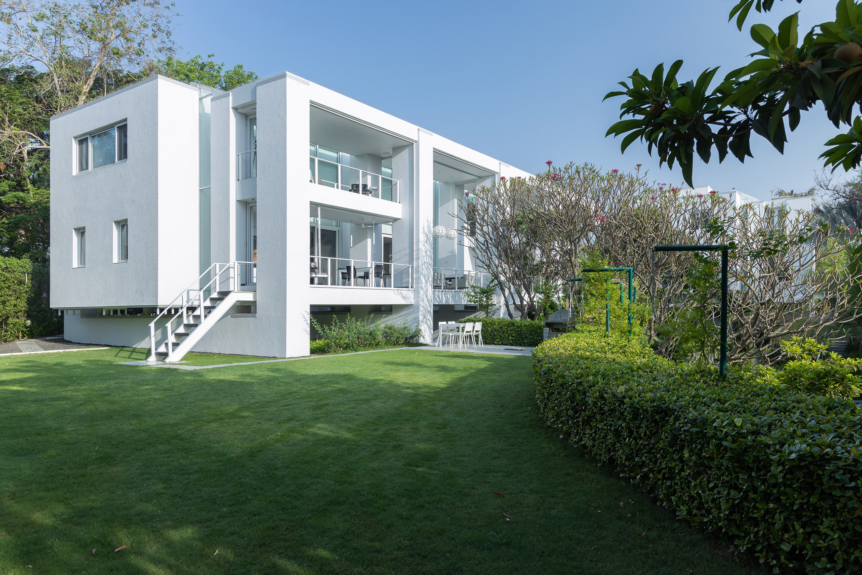 В постройке использованы высушенные на солнце кирпичи, ее белый фасад обеспечивает минимальное поглощение тепла, а черная каменная плитка гарантирует его отдачу. Энергосберегающие стеклопакеты, солнцезащитные экраны и крыша из майоликовой плитки обеспечивают комфорт в течение 9 месяцев в году без кондиционирования воздуха. Кроме того, здание оборудовано системой сбора дождевой воды. Окружающий резиденцию тенистый сад поддерживает биоразнообразие и экологическую среду.
