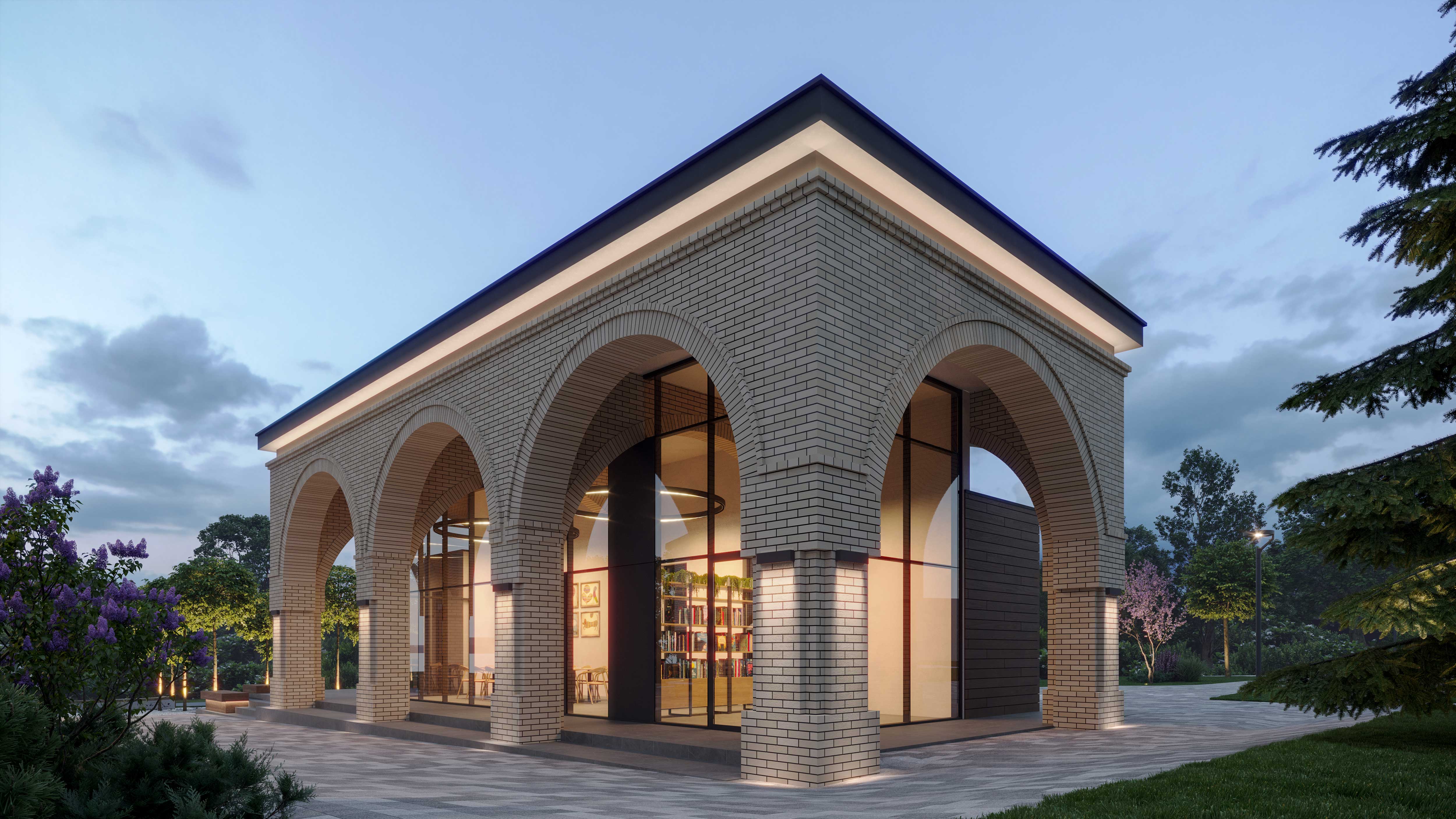Проект воскресной школы выполнен с духе синтеза элементов традиционного каменного храмового зодчества и современной архитектуры. Традиционные кирпичные арочные элементы создают пространство защиты от осадков и солнца и олицетворяют самый сложный и красивый элемент храма – переход от барабана к колоннам через арки.