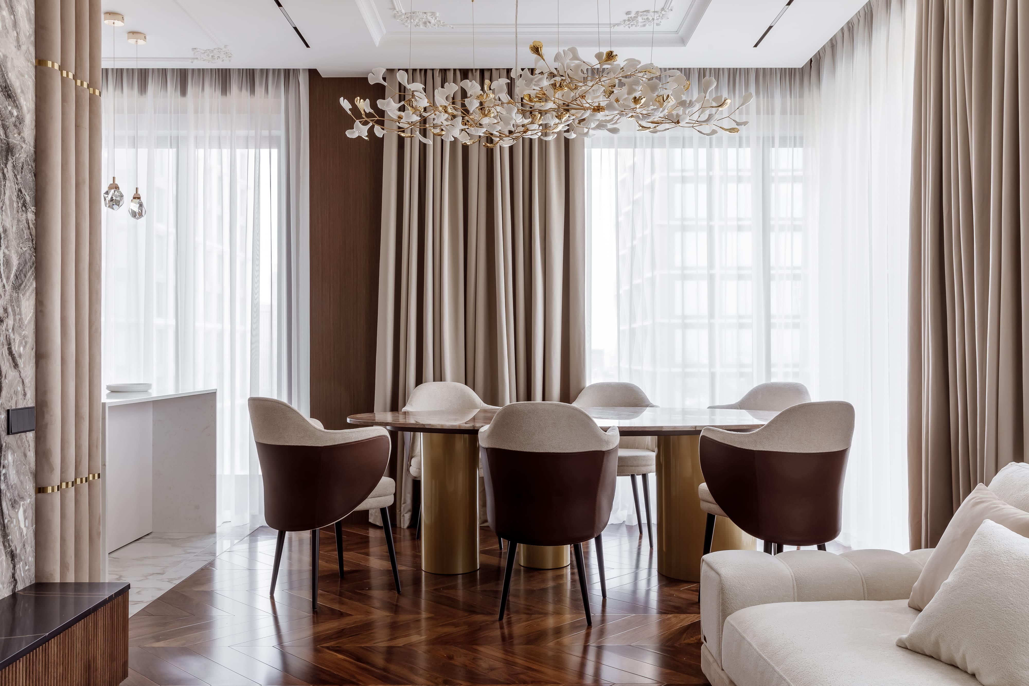 Интерьер готовился в соответствии с архитектурой жилого комплекса и его внутренним убранством, чтобы квартира выглядела органично в этом доме. Внутри квартиры расположены три спальни, три санузла, гардеробная, прачечная и кухня-гостиная. Одна из главных особенностей этой квартиры заключается в том, что её планировка от застройщика и не подвергалась никаким изменениям.