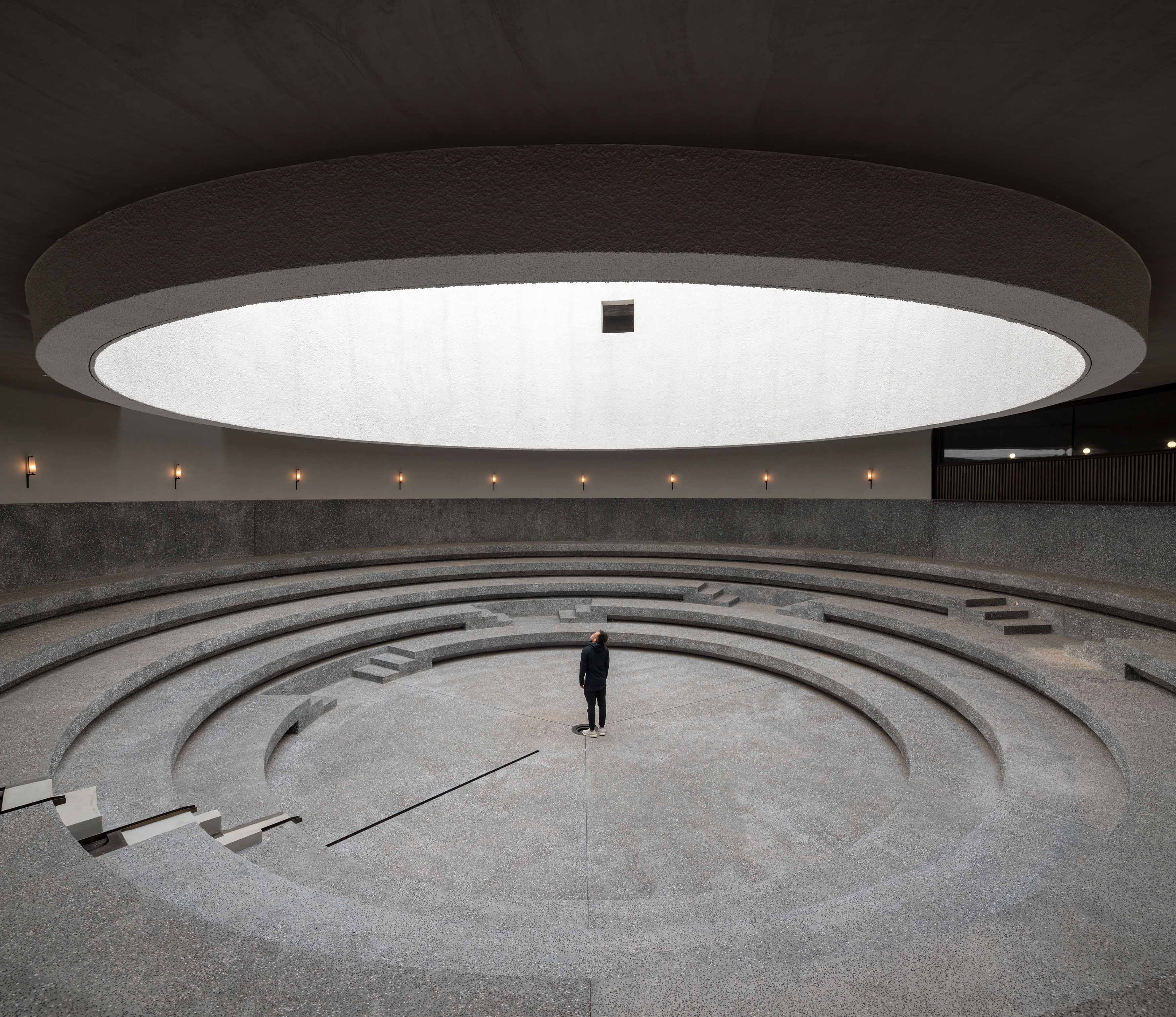 О проекте: Центральный элемент здания из темно-серого фактурного бетона – внутренний двор в форме амфитеатра с каменными скамьями, который может использоваться под разные задачи: как бассейн, если наполнить его водой, как площадка для проведения мероприятий или как место отдыха. Таким образом, проект объединяет в себе общественное пространство и художественную галерею. Выставочные залы внутри связывает коридор, который по спирали плавно закручивается вокруг амфитеатра. Он начинается на первом этаже, где находится кафе, и заканчивается на крыше. На ней расположена обзорная площадка, откуда открывается потрясающий вид на окрестности.