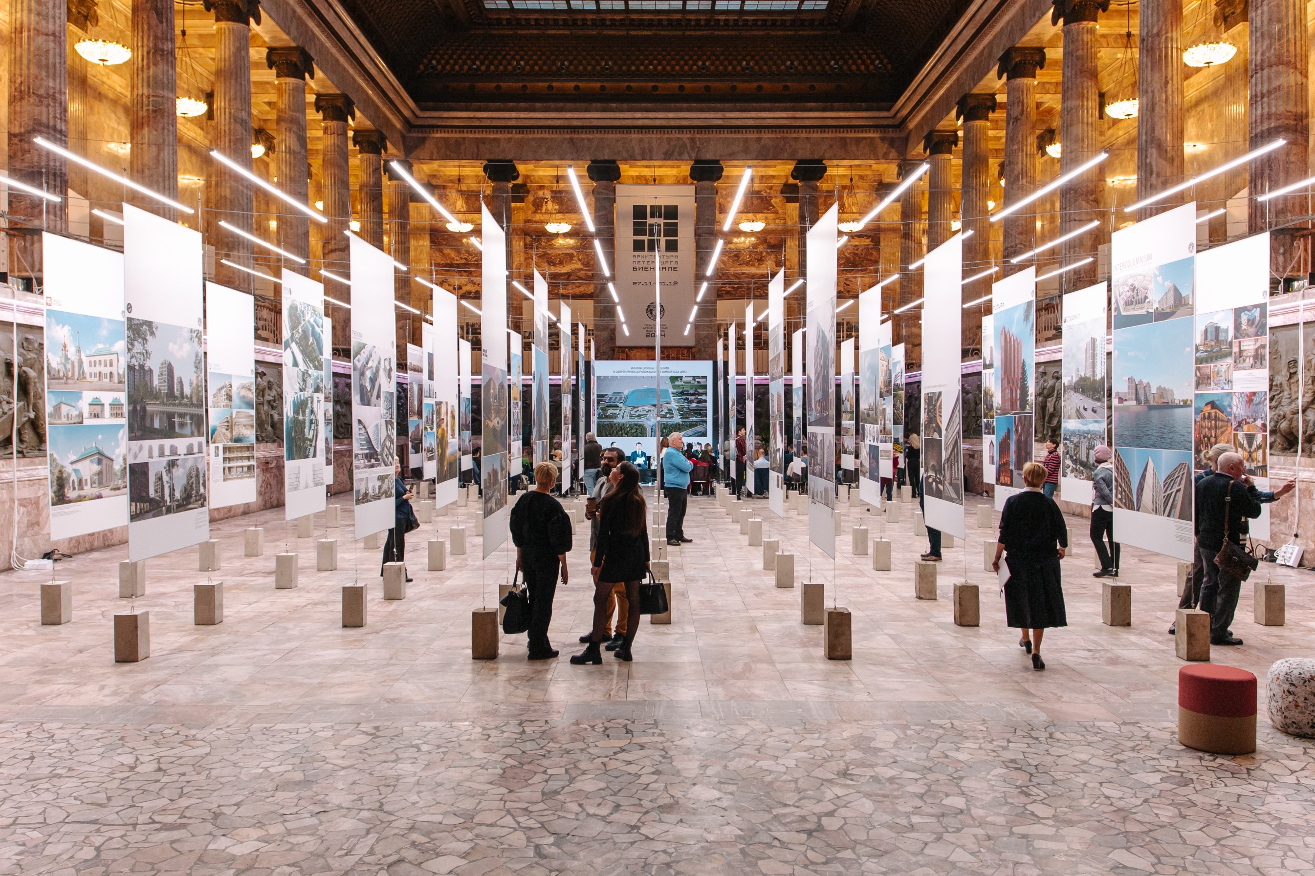 Описание проекта, предоставленное заявителем: Основное технологическое соображение – использовать существующую стоечно–балочную конструкцию исторического здания, серию мраморных колонн, как опору. Контрастное решение реализовано в виде холстов на вантовых оттяжках с пригрузами. Экспозиция производит впечатление лёгкости и проницаемости. Визуальное ядро – в направлении медиаэкрана. Масса конструкций и планшетов с освещением стремится к нулю в противоход тяжелому и массивному Мраморному залу. Это воплощение хайтека с опорой на классику.