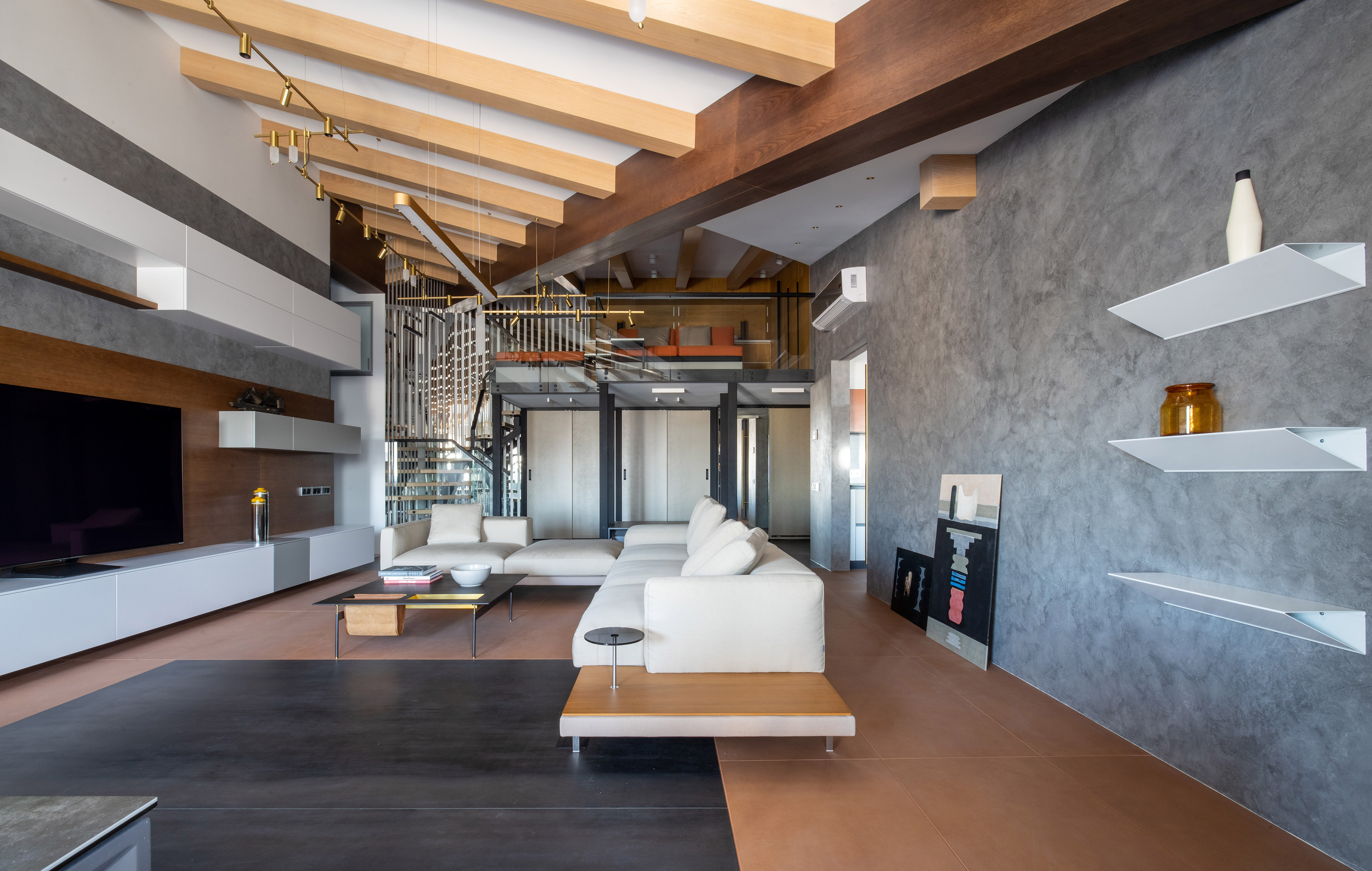 Конструкция стропил в проекте была декоративно обыграна; Высота потолков позволила разместить антресоль с лаунж-зоной, антресольный шкаф с подсветкой фасадов над зоной санузлов; Над помещением хоз. блока устроен мини-чердак с лестницей-трапом; Прихожая образует общий объем с гостиной; Благодаря прозрачной двери из гостиной в кухню, достигается цельность структуры интерьера.