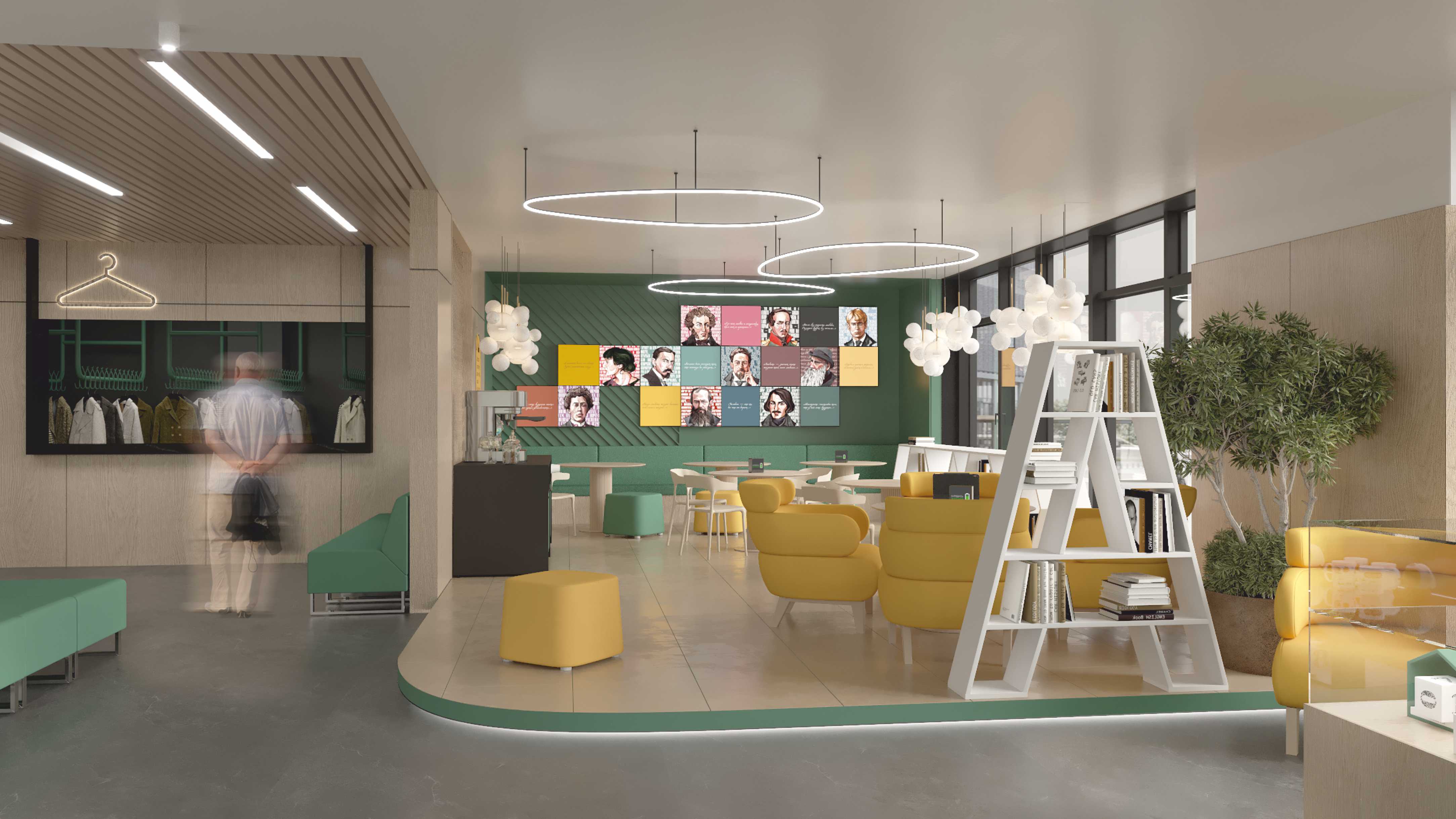 Наша команда старалась создать пространство, в котором объединяются чтение, игра, творчество и общение. На площади 1800 кв. м. расположились комната приключений и детский амфитеатр, книжные джунгли. Для подростков создана «Комната генерации идей» с удобной зоной чтения, возможностью проведения презентаций, дискуссий и клубов по интересам. Каждое пространство задумано мультиформатным, что обеспечивает постоянный поток событий, контакт с экспертами, рождение проектов и команд. Библиотека становится многофункциональным пространством, где происходят новые знакомства, мозговые штурмы, мини-презентации, лекции и дискуссии.