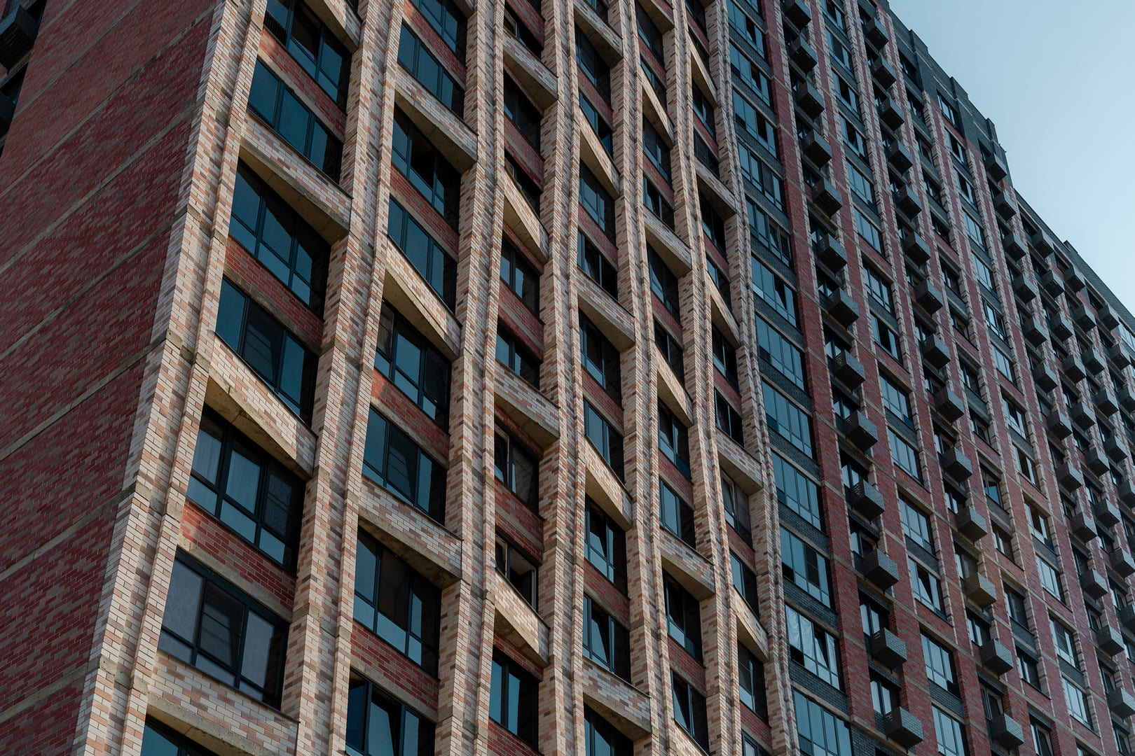 Фасад получил множество элементов, в той или иной степени отсылающих к теме авангарда. Линии крыш дополнили вертикальными остекленными и белыми прямоугольниками лоджий. Выступающие плоскости балконов разбросаны по фасаду в отрывистом сложном ритме, напоминающем ритмический рисунок строфы Маяковского. На одной из внешних стен между окнами выложили ниспадающую изогнутую линию, похожую на театральный занавес. Весь фасад словно бы состоит из противостояния и равновесия разноцветных четырехугольников и линий.