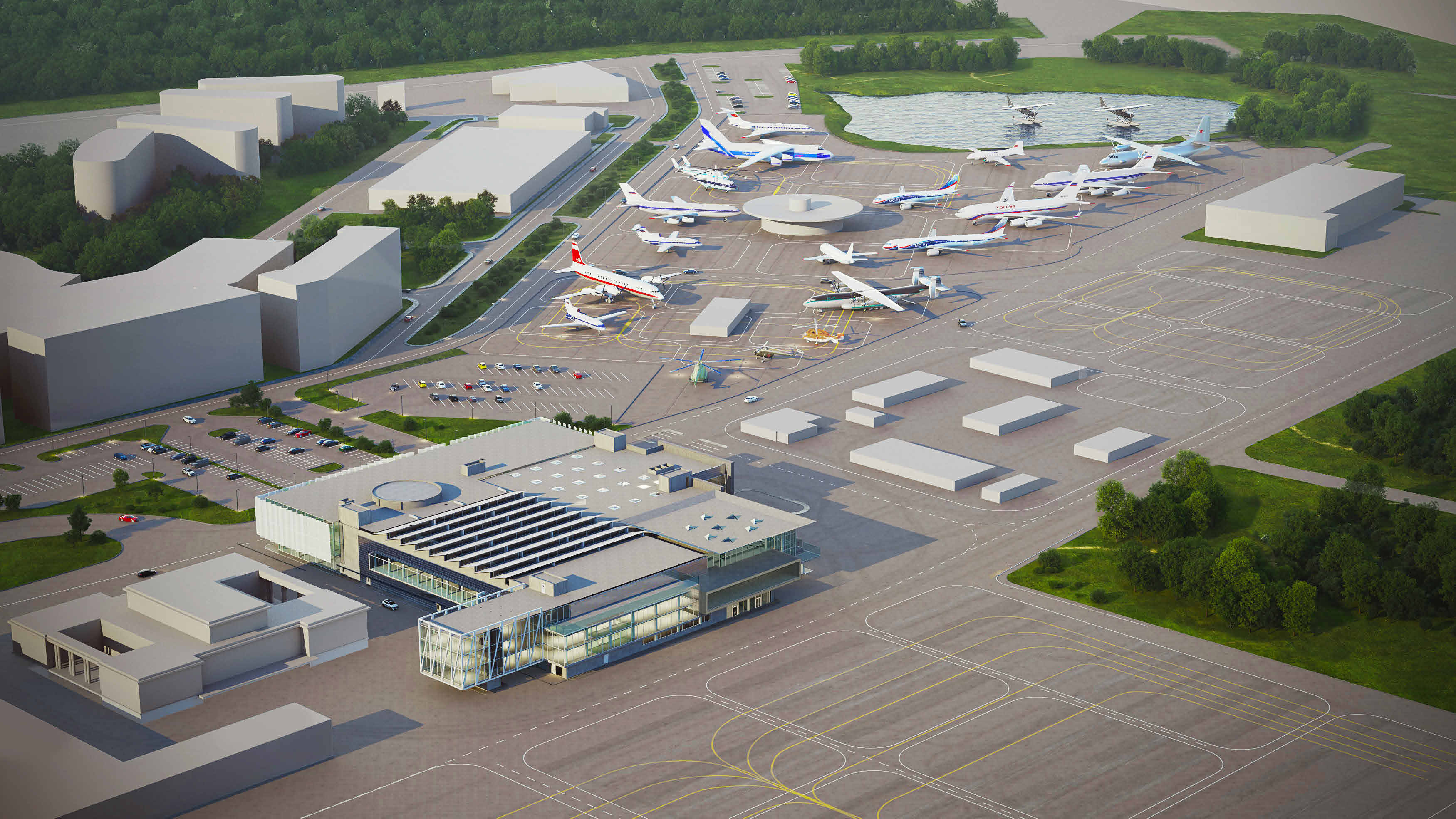 Центром объёмной композиции здания является лаконичный параллелепипед, верхние уровни которого декорируются современными металлоконструкциями из перфорированного металла. Архитектурные решения с открытыми инженерными коммуникациями подчёркивают технический характер экспозиции и содержат аллюзии на конструктивные элементы первых аэропланов.