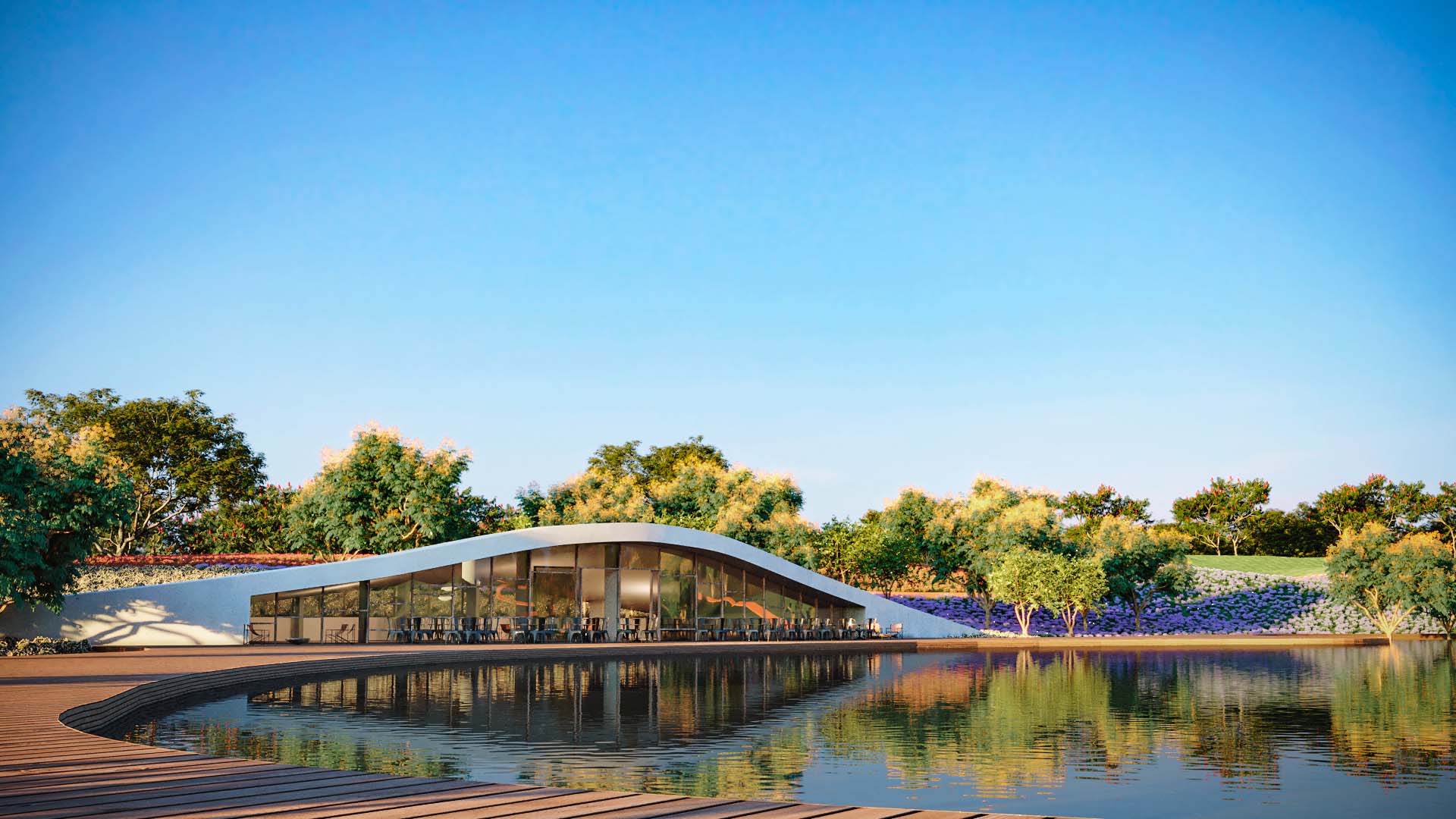 О проекте: На итальянском baffi означает «усы». Именно такую ассоциацию вызывает у автора новое общественное пространство, которое планируется разместить в первом цветочном саду подобного размера на территории Бразилии. Территория сада сплошь состоит из спусков и подъемов, и с каждого возвышения перед посетителями открывается новый вид. Проект представляет собой здание ресторана, изящно вписанного в существующий ландшафт и выгодно оттеняющего его. Здание ресторана предлагается оформить в виде своеобразной пещеры и укрыть сверху изогнутой крышкой, замаскированной под газон.