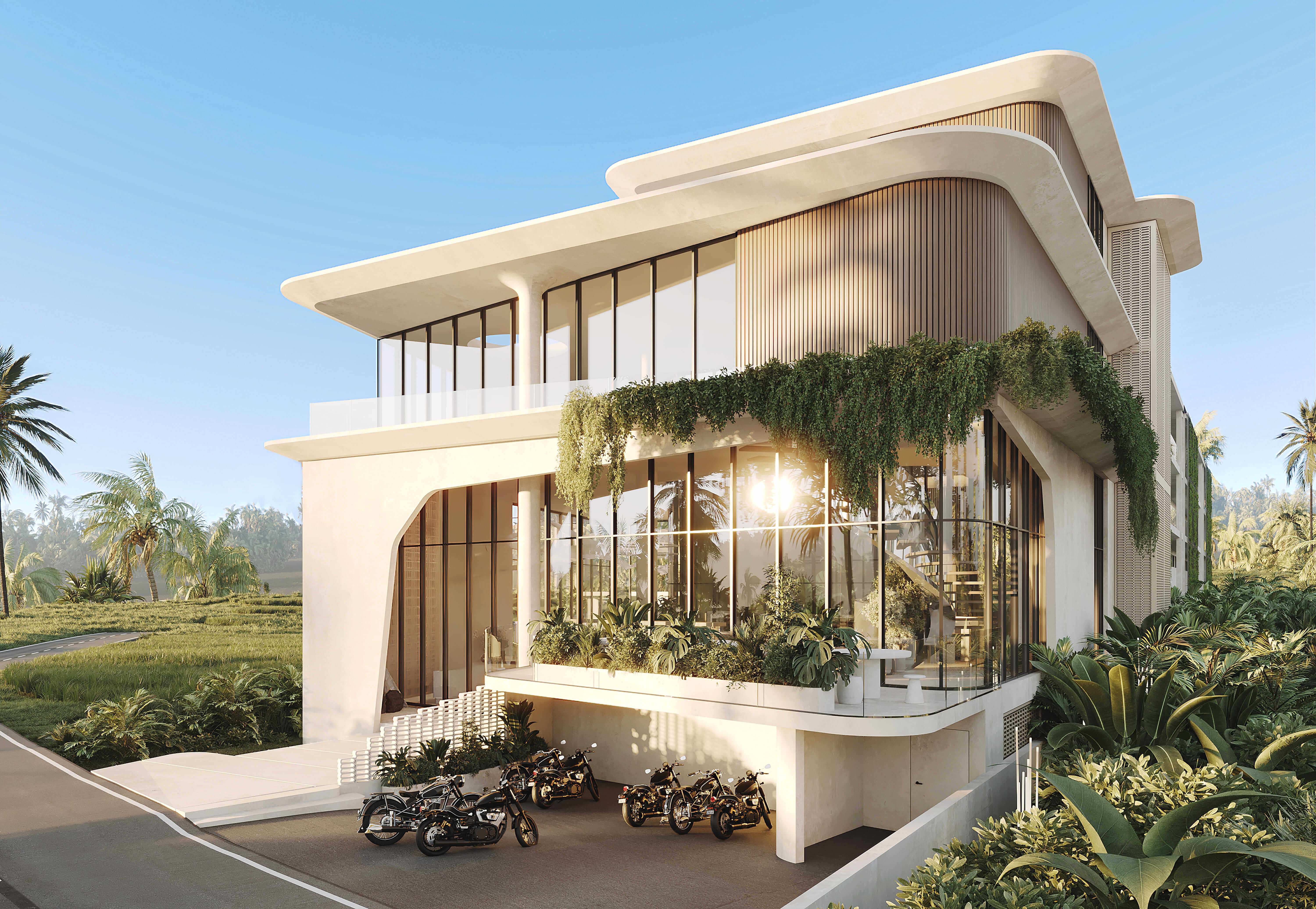 Это пространство для жизни, работы, отдыха людей с одинаковыми ценностями, с одинаковым пониманием качества и хорошего сервиса. Вдохновленная формами рисовых полей, линейная архитектура мягко интегрируется в балийский ландшафт, сочетая в себе лучшее из строительных и природных материалов.