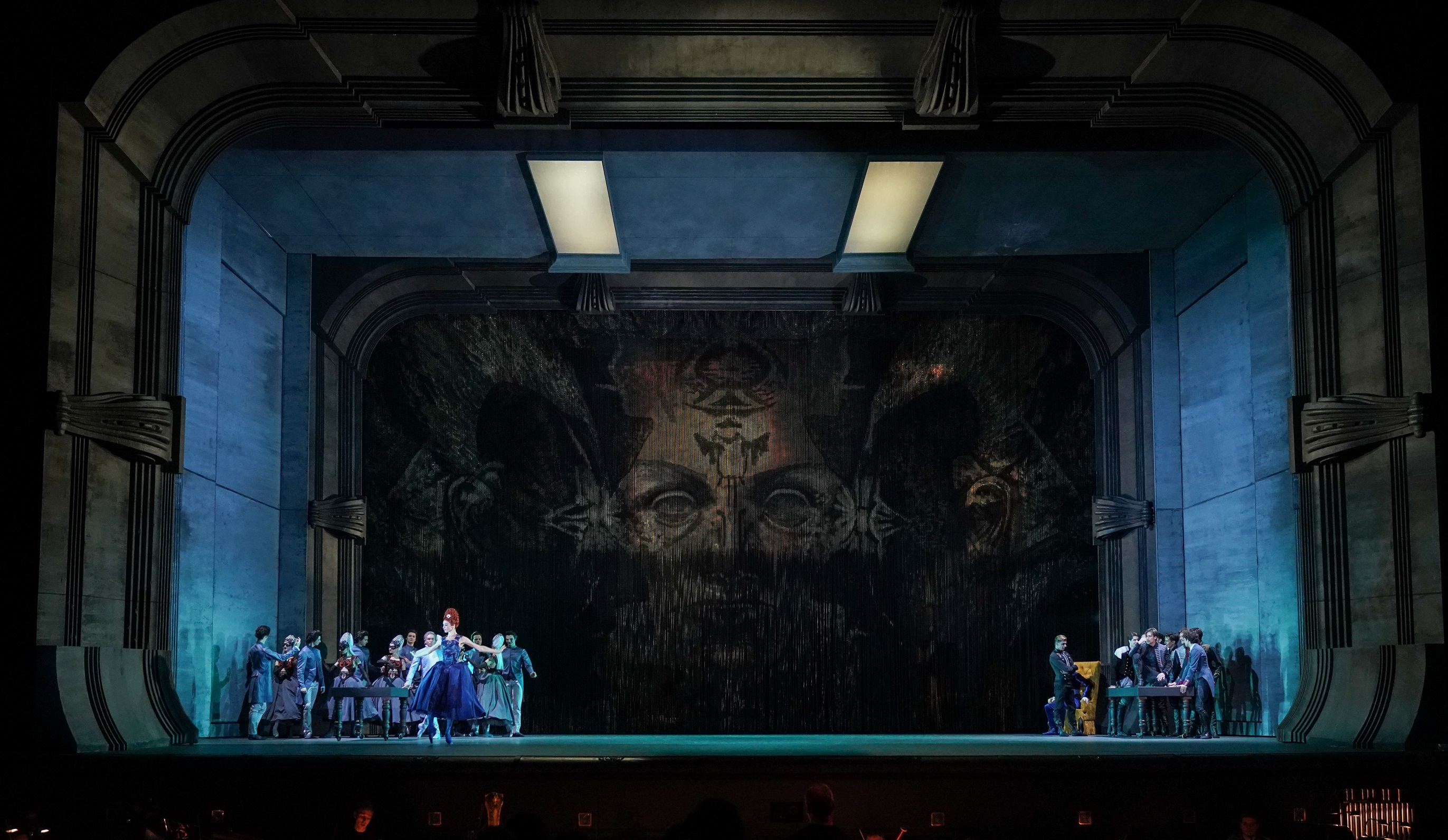 Полина Бахтина, впервые работавшая на постановке в Большом театре, создала — зловещим рисунком гобелена или покрытым патиной времени гигантским зеркалом на заднике, уходящими вглубь сцены — и времён — золочёными рамами, вздымающимся тюлем занавесей — образ города величественного, но полного тайн и скрытой угрозы, существующего, как между веком нынешним и минувшим, между двумя мирами, один из которых — самый настоящий мираж, да и второй не полностью реален.