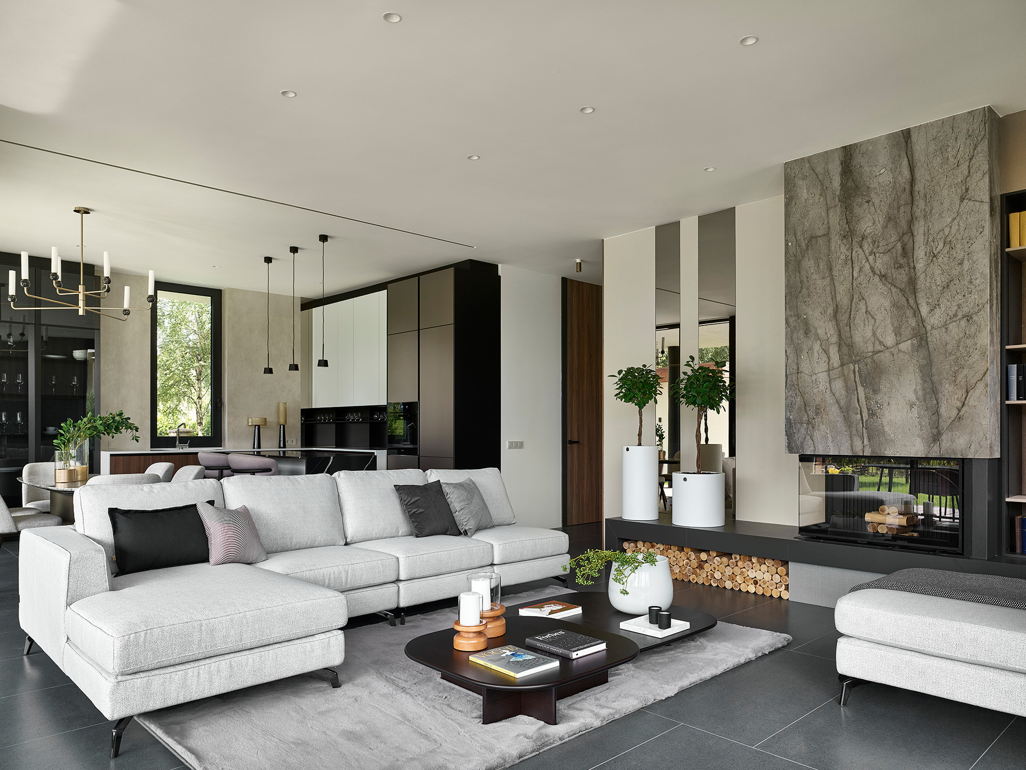 Внутренний мир дома оживает благодаря сочетанию разнообразных материалов и цветов. Металлические, зеркальные и глянцевые поверхности контрастируют на фоне дерева, натурального камня и различных фактур текстиля. Цветовое решение интерьера также основано на контрастах. Нейтральные базовые тона выступают в качестве палитры, в то время как яркие акценты добавляют динамичности и энергии. Эта игра светлых и темных оттенков, мягких и жестких текстур создает ощущение глубины и объема в каждой комнате.