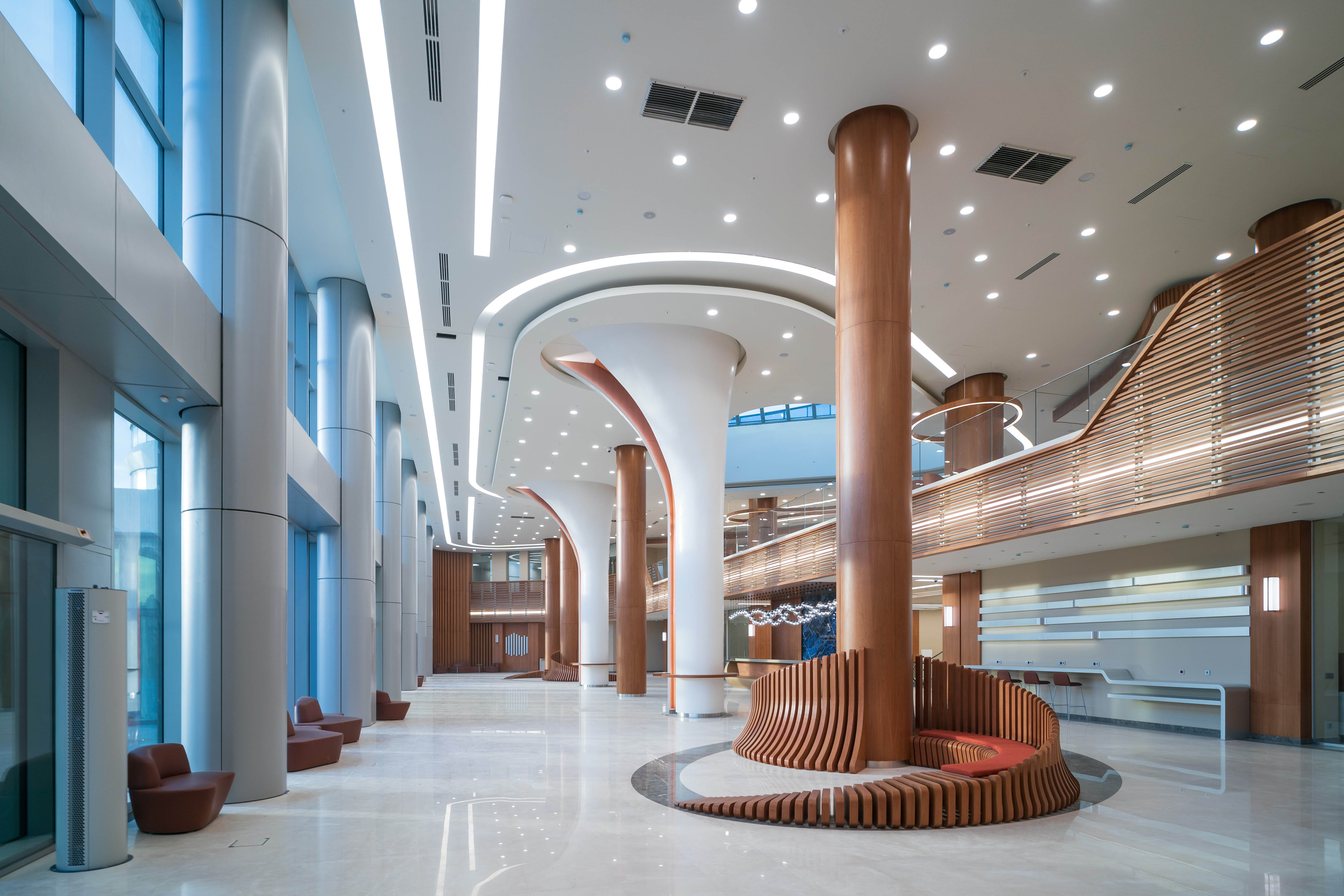 Здесь всё направлено на создание комфорта для наших пациентов и персонала. На первом этаже сосредоточены самые востребованные направления амбулаторной диагностики и лечения для взрослых и детей. В просторном фойе, площадь которого более 1 340 кв. м, всё продумано до мелочей: эргономичные и деловые зоны ожидания, аптека, видовое кафе с естественным освещением. Полы выполнены из мрамора, стены и колонны облицованы шпоном.