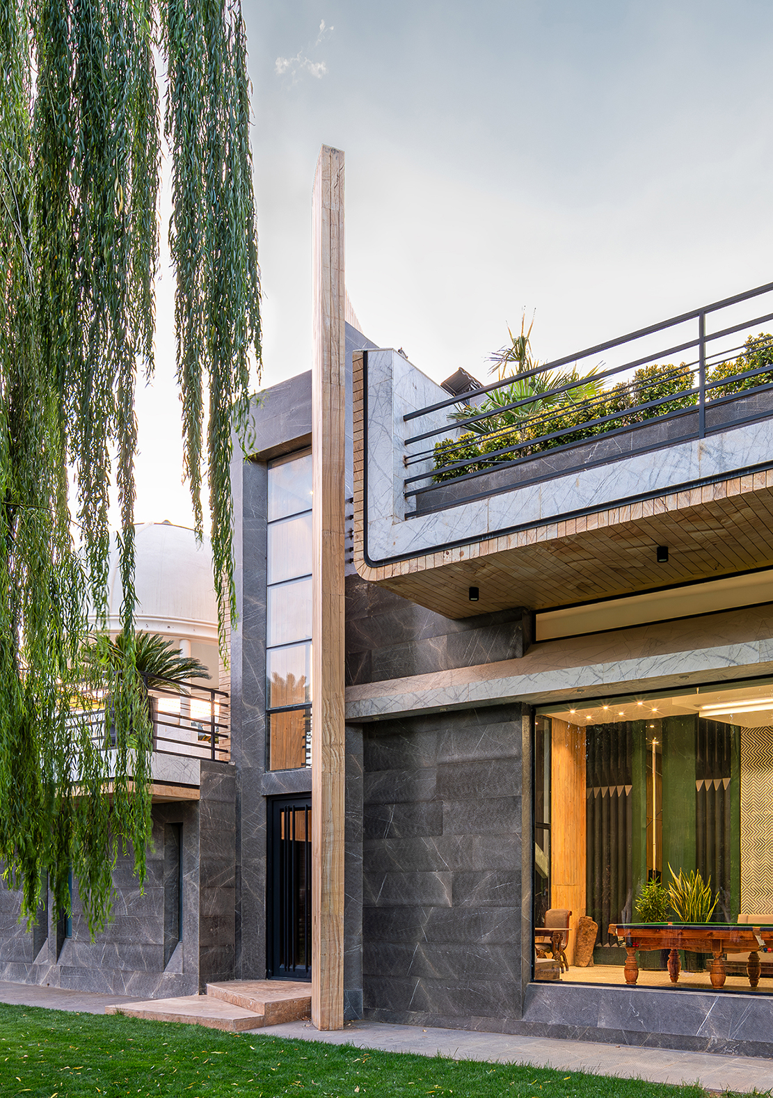 Описание проекта, предоставленное заявителем: Проект частного дома в крупном коттеджном поселке. Среди пожеланий заказчика было наличие бильярдной, конференц-зала, крытого бассейна и служебных помещений. В процессе разработки проекта авторы постарались расширить зеленое пространство и частично интегрировать его в здание, чтобы не нарушать визуальный ряд и не устанавливать границы. Для этого были использованы большие панорамные окна, высокие потолки, эксплуатируемая кровля с озеленением, а также соответствующие строительные материалы и плавные пространственные формы.
