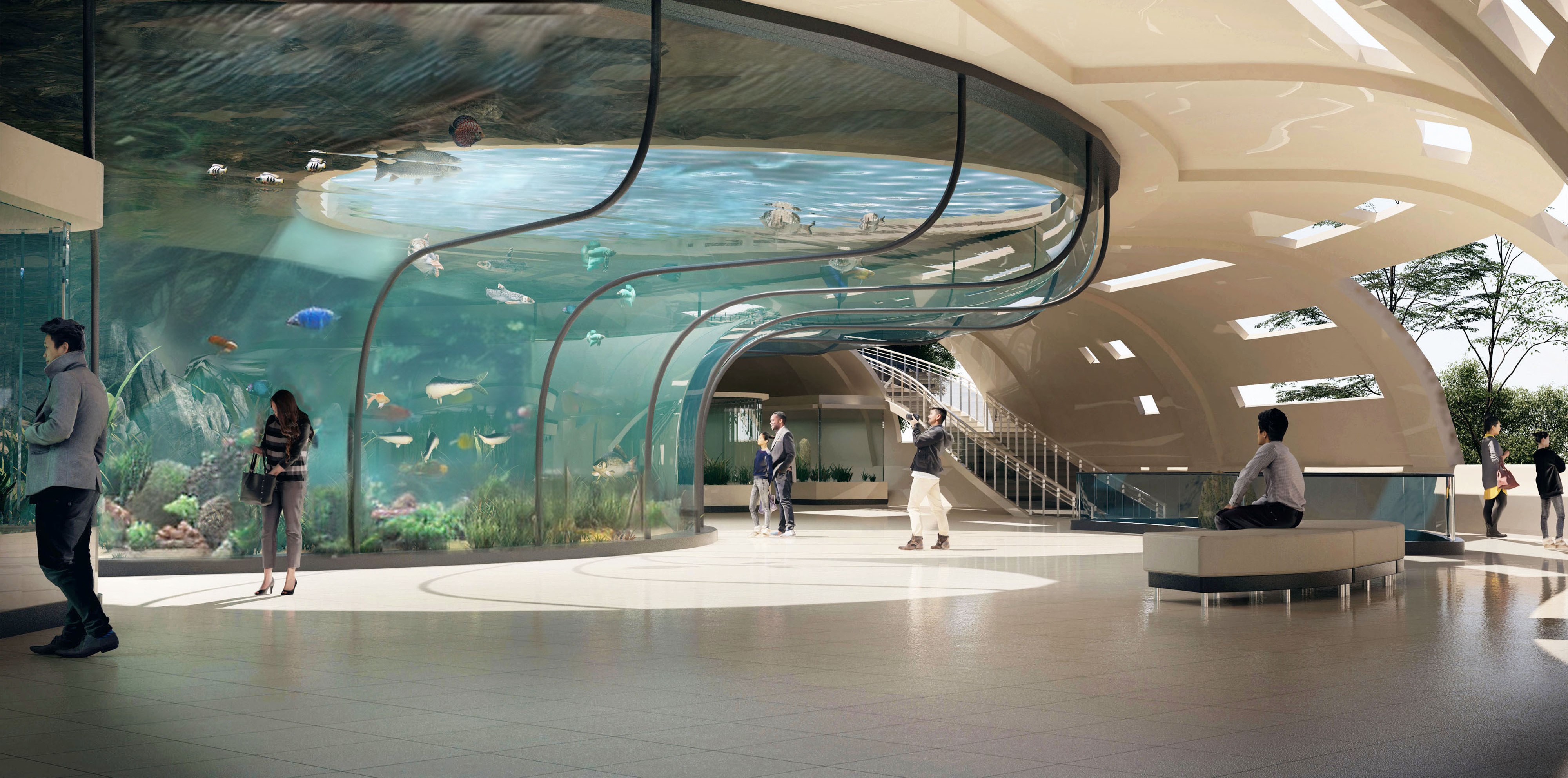 О проекте: Все проектные решения обусловлены функциональным назначением зданий. В них должны будут разместиться научно-исследовательский центр и институт проблем окружающей среды. Они займутся изучением огромного разнообразия флоры и фауны лесов и зеленых зон внутри города Мумбаи с последующей разработкой стратегий и планов по улучшению условий жизни горожан. Проект вписывает здания в сложный рельеф участка. На самых затененных местах предусмотрены площадки для отдыха. Здания имеют С-образную форму и обращены в сторону преобладающих ветров, что позволяет обеспечить естественную вентиляцию внутри. В качестве строительных материалов используются бамбук, гибкие листы металла и поликарбоната.
