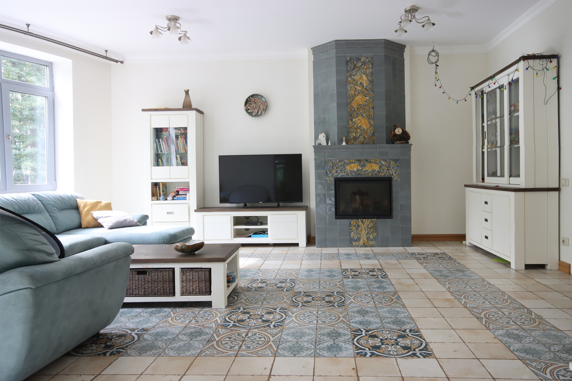В облицовке сочетаются строгая мануфактурная керамическая плитка и рельефные панно, сделанные в единственном экземпляре. Кабаны - семейная реликвия для хозяев и главные персонажи на панно.