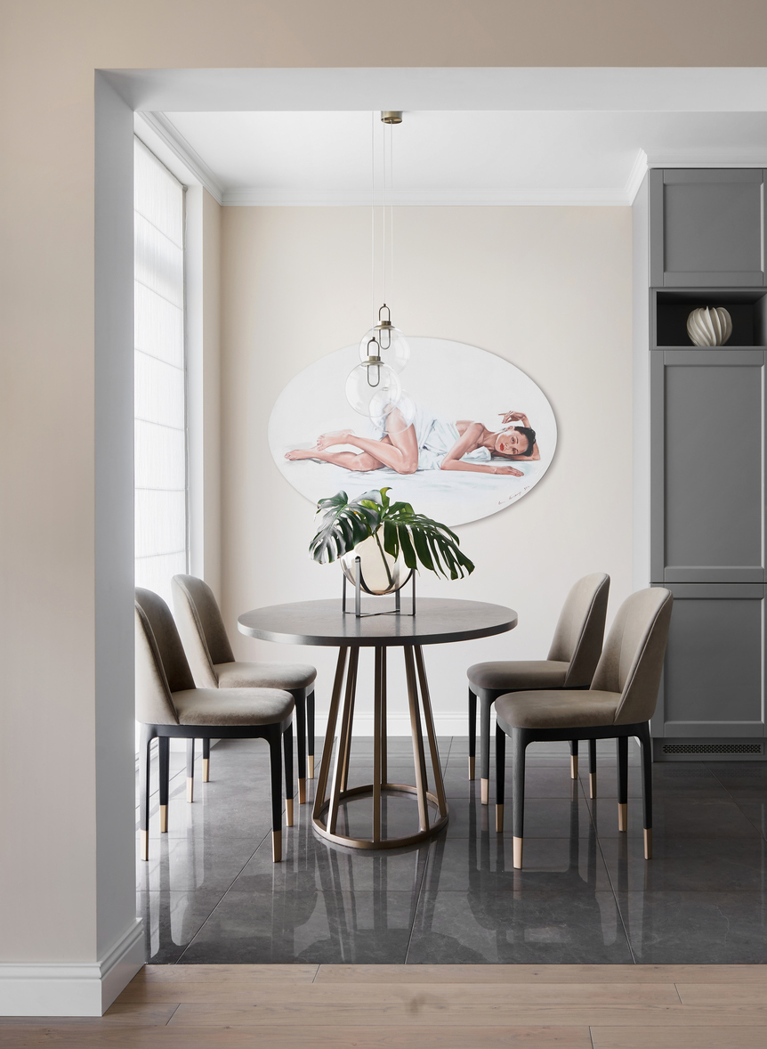 Дизайнер Мадина Богатырёва любит современную интерпретацию классики: светлые стены, нейтральную цветовую гамму с яркими акцентами и современное искусство на стенах. В этом проекте все компоненты присутствуют и ненавязчиво поддерживают друг друга.