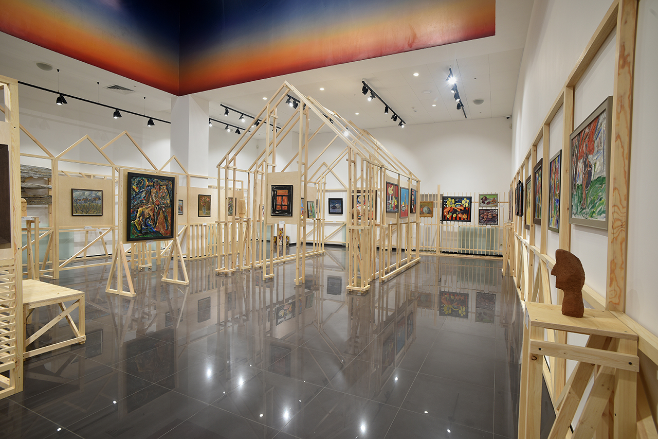 Выставка живописи и скульптуры Александра и Владимира Буровых – профессиональных художников, которые живут в оренбургской глубинке. Живописная манера у Александра более реалистическая, Владимир тяготеет к абстракции. Но выставка не о различии творческих почерков. Буровы – «чудики»: в селе их не понимают, на жизнь они зарабатывают крестьянским трудом. Несмотря на это братья не спились, не бросили живопись. Они пишут деревню так, словно это и есть весь мир. Именно о сельской вселенной и рассказывает выставка. Отсюда ее дизайн – активный, выполняющий роль интуитивно понятного интерфейса. Выставка построена по тематическому принципу – братья пишут ограниченный набор сюжетов: дом, сад, двор со скотиной, село, жители, окрестные пейзажи. Конструкции, на которых демонстрируются картины, – подсказка зрителю, которому сложно воспринимать современное искусство. Дизайн подчеркивает специфику живописи и одновременно является самостоятельным элементом показа, создает атмосферу.