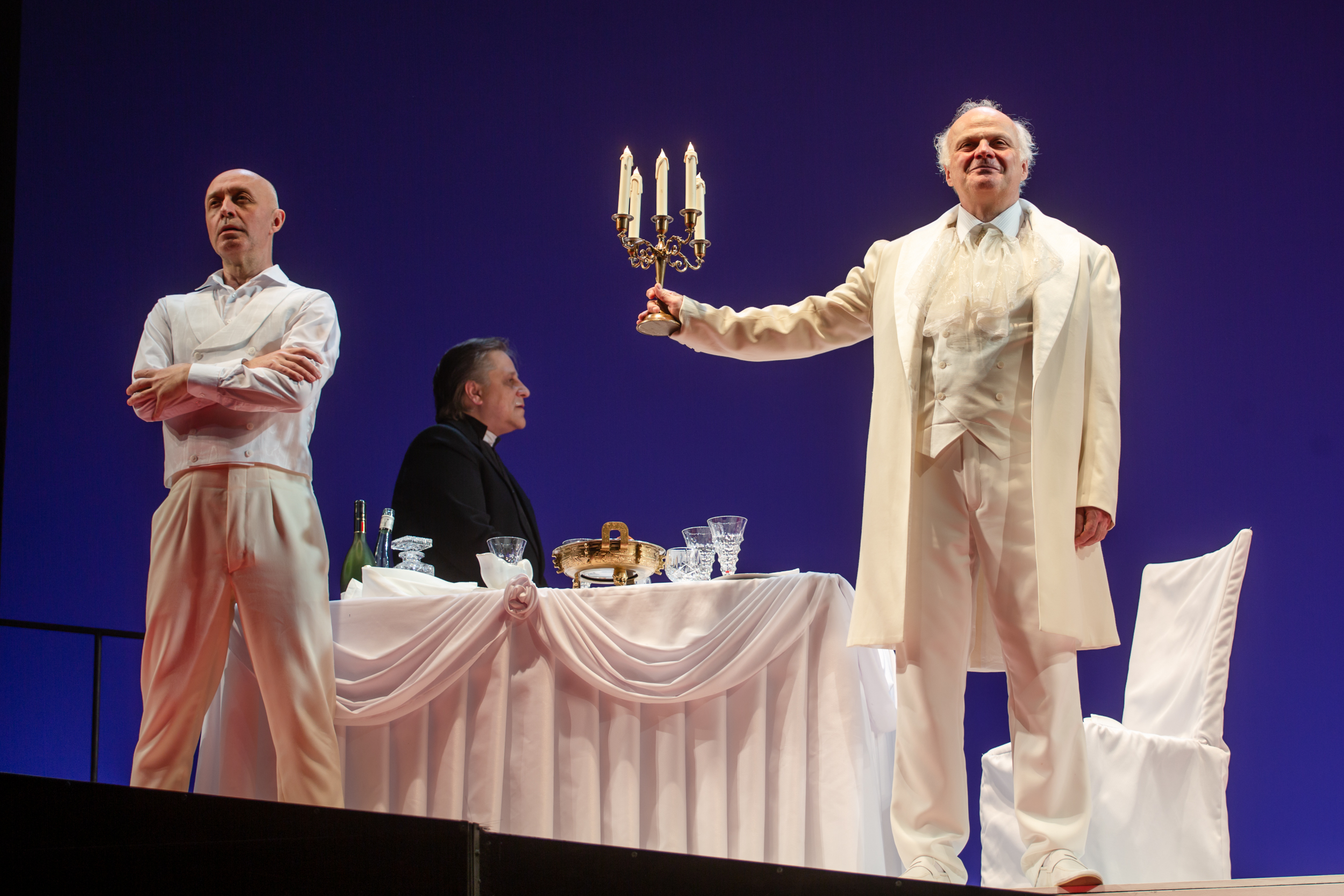 В центре спектакля двоемирие. Первый - суматошный, добрый, человечный мир театра. Второй – корыстный мир, готовый убить, распять, пытать. В этой метафоре противопоставлены не столько художник и власть, сколько светлое и темное начала, борющиеся за душу каждого, будь то король или служитель муз.