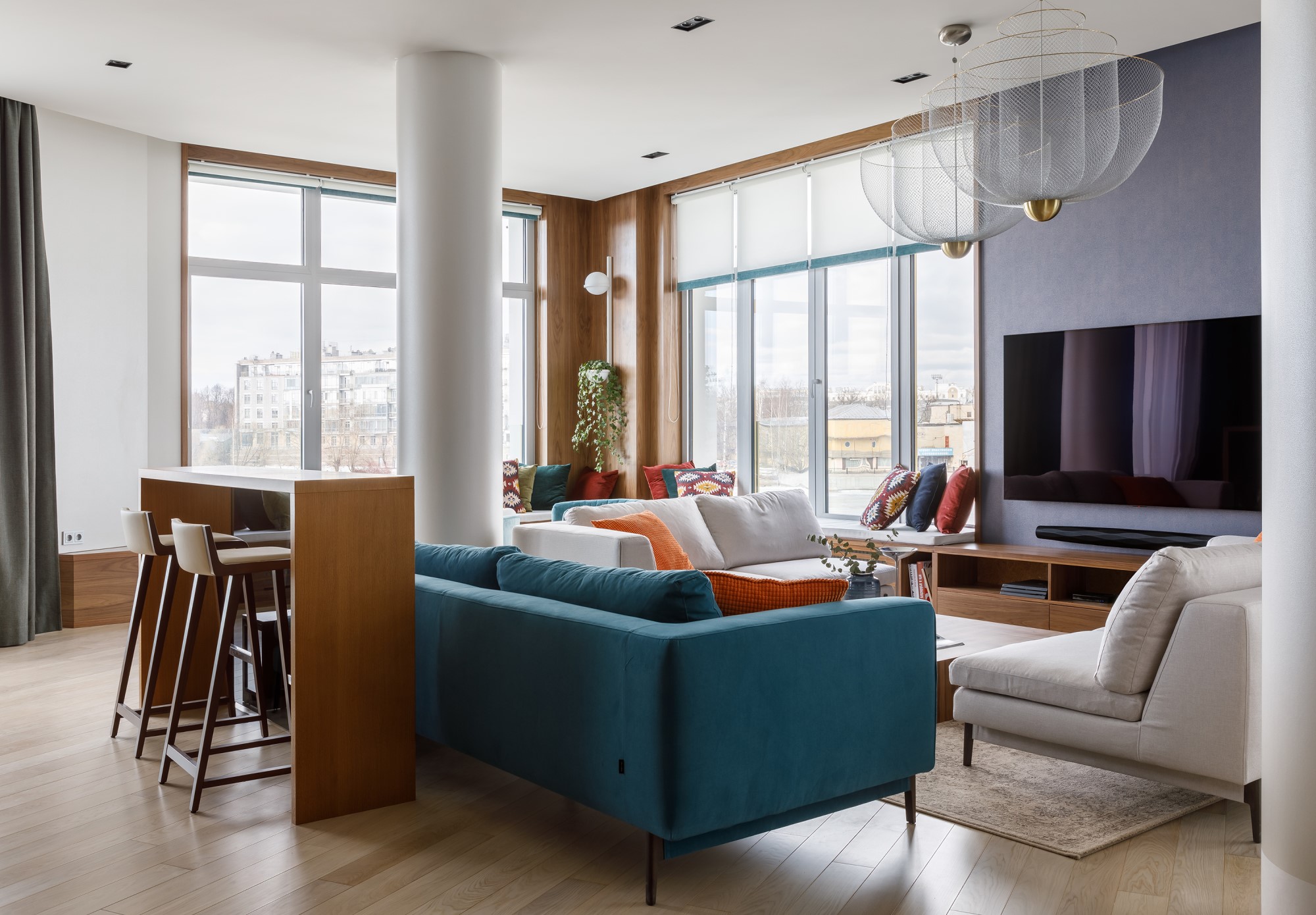 Из окон этой квартиры открываются уникальные виды на воду и далекие горизонты. Задачей творческой команды было создание интерьеров с не меньшей природной энергией и эмоцией.
