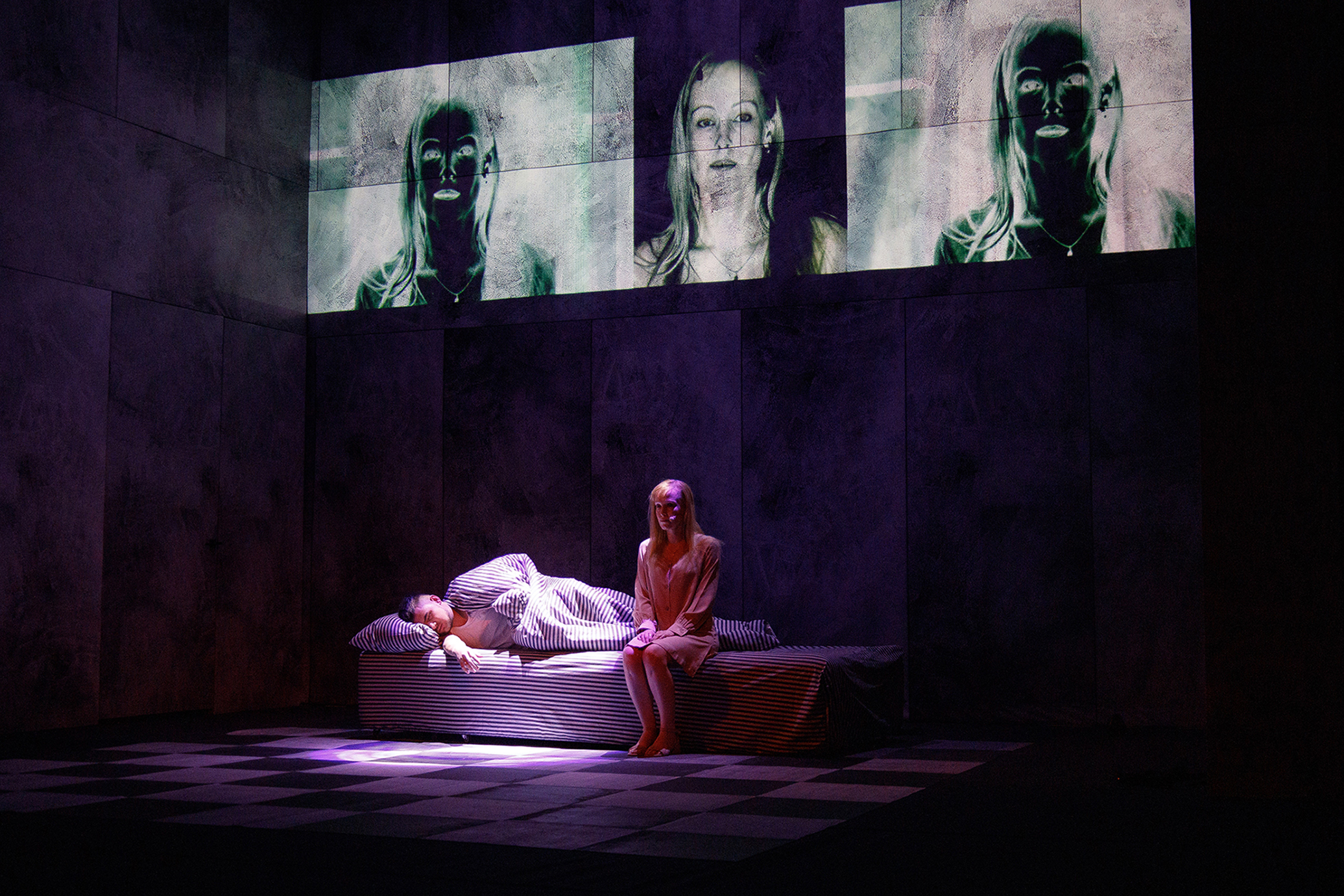 Сценография спектакля разделена на "театральную зону" - основной павильон в первой трети сцены, он виден зрителям (становится номером в гостинице, ресепшеном, парковкой) - и "кино-зону", расположенную в глубине сцены за разделительным задником - это четыре мини-павильона (путем перестановки мебели и реквизита они становятся лекторием, кабинетом шефа полиции, кабинетом психолога, лабораторией, допросной, коридором), эпизоды спектакля в них снимаются на камеру и транслируются онлайн при помощи проектора на задник основного павильона.