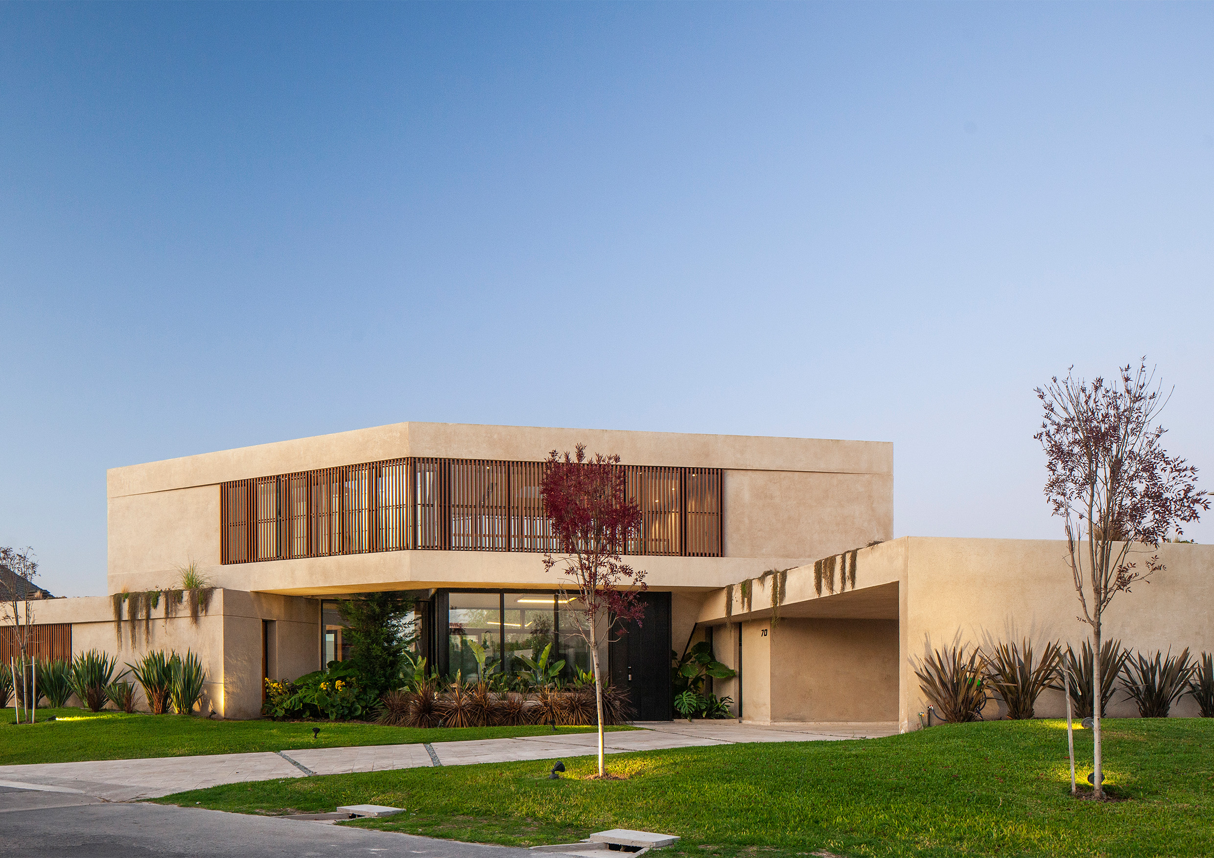 О проекте: Участок, на котором стоит дом, имеет треугольную форму, сужаясь от входа в сторону своей задней части, что, собственно, и определило форму постройки. Два прямоугольных объема расположены на уровне первого этажа. В них организованы столовая, кухня, зона для гриля, прачечная, а также другие общественные и служебные помещения. Здесь же предусмотрена хозяйская спальня с личной ванной комнатой и гардеробной.