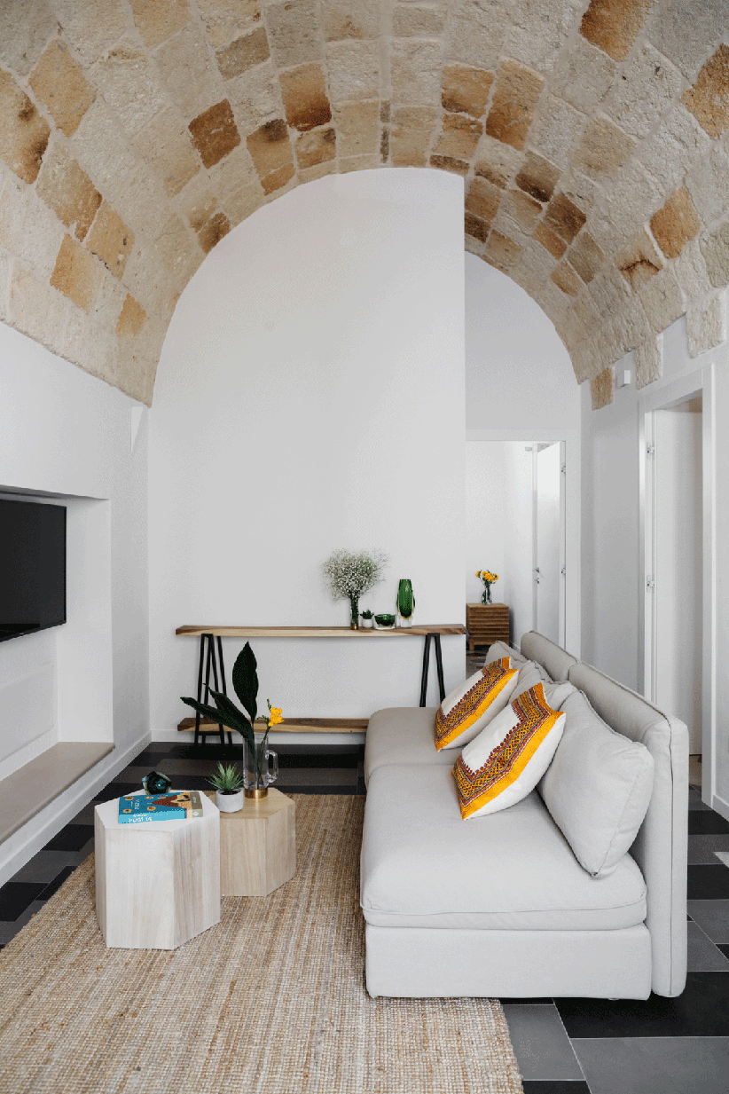 На момент реконструкции здание было в очень плохом состоянии, однако кое-что автор проекта решил сохранить: покрытые патиной стены из туфа, сводчатый потолок с каменной кладкой и цементитовые полы. К реконструированной квартире примыкает небольшая студия с отдельным входом.