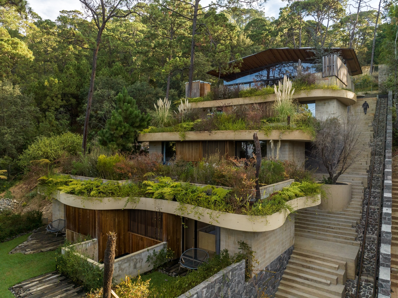 О проекте: Проект частного дома, реализованный на участке с существенным перепадом высот по заказу двух братьев, которые планируют проживать здесь со своими семьями. Террасирование выполнено с использованием платформ неправильной формы, которые также задействованы для дополнительного озеленения.