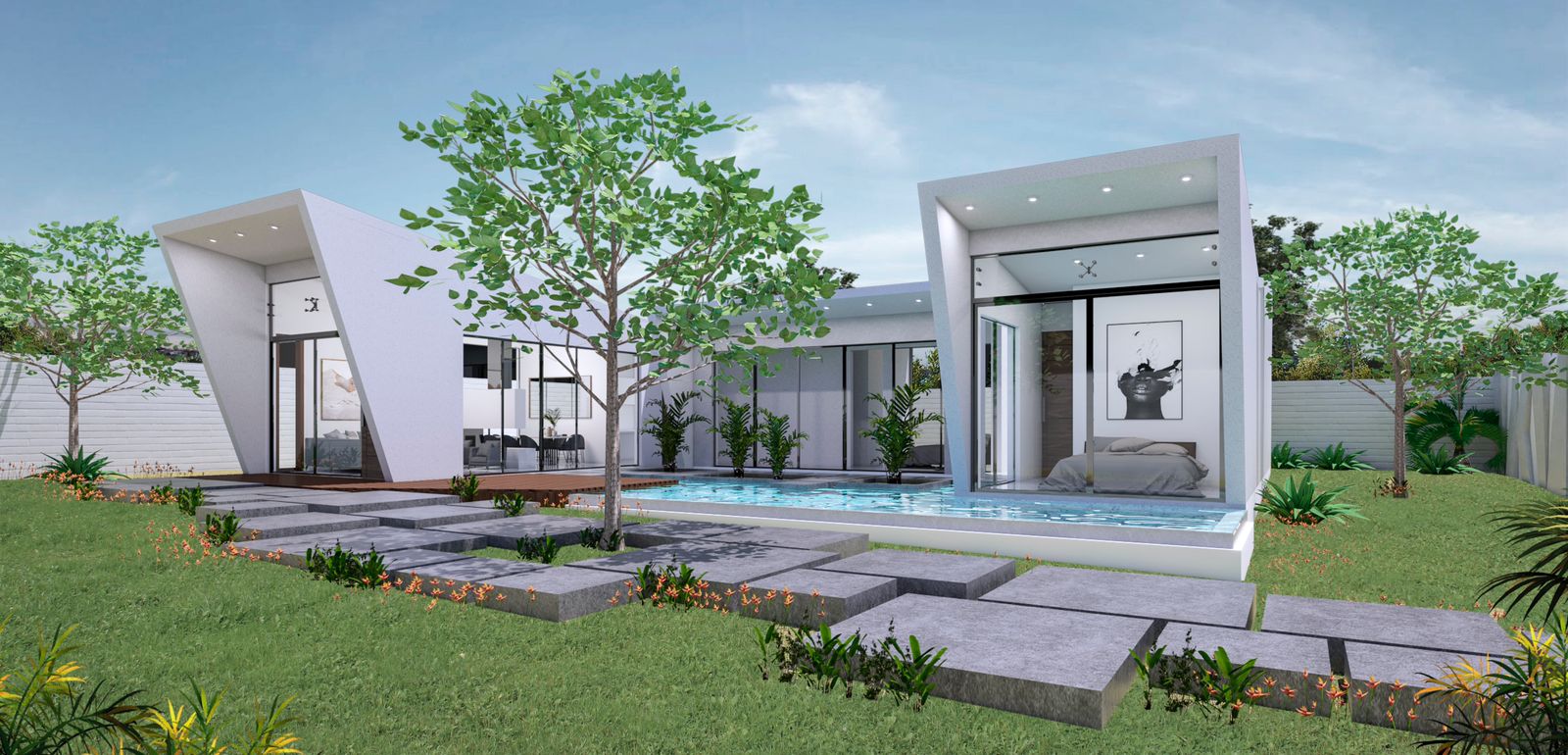 Три отдельных объема гармонично объединены в единую конструкцию, обрамляющую прямоугольный бассейн на заднем дворе. Расположенные под разными углами скатные кровли символизируют распростертые крылья.