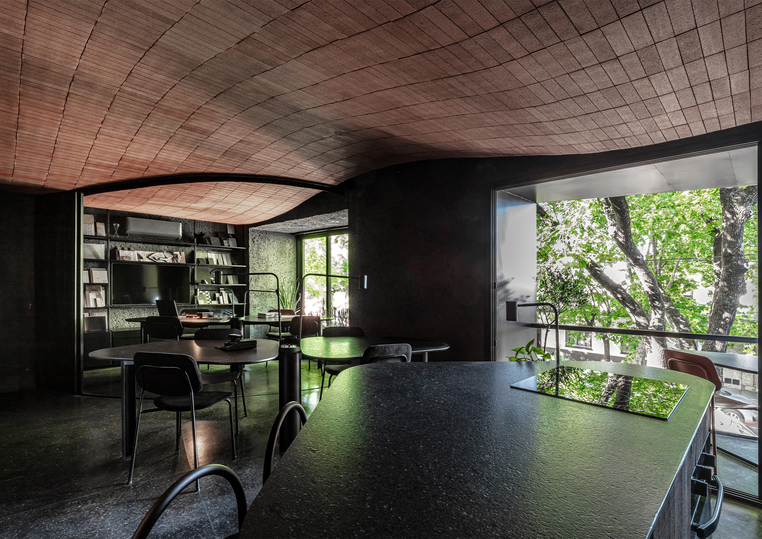 Изогнутый потолок, под которым расположены несколько рабочих столов и множество стеллажей с образцами продукции, выложен прямоугольной плиткой. Столешницы из гранита, стеновые панели и металлические стеллажи оформлены в темных цветах, выпуская на авансцену потолочную конструкцию.