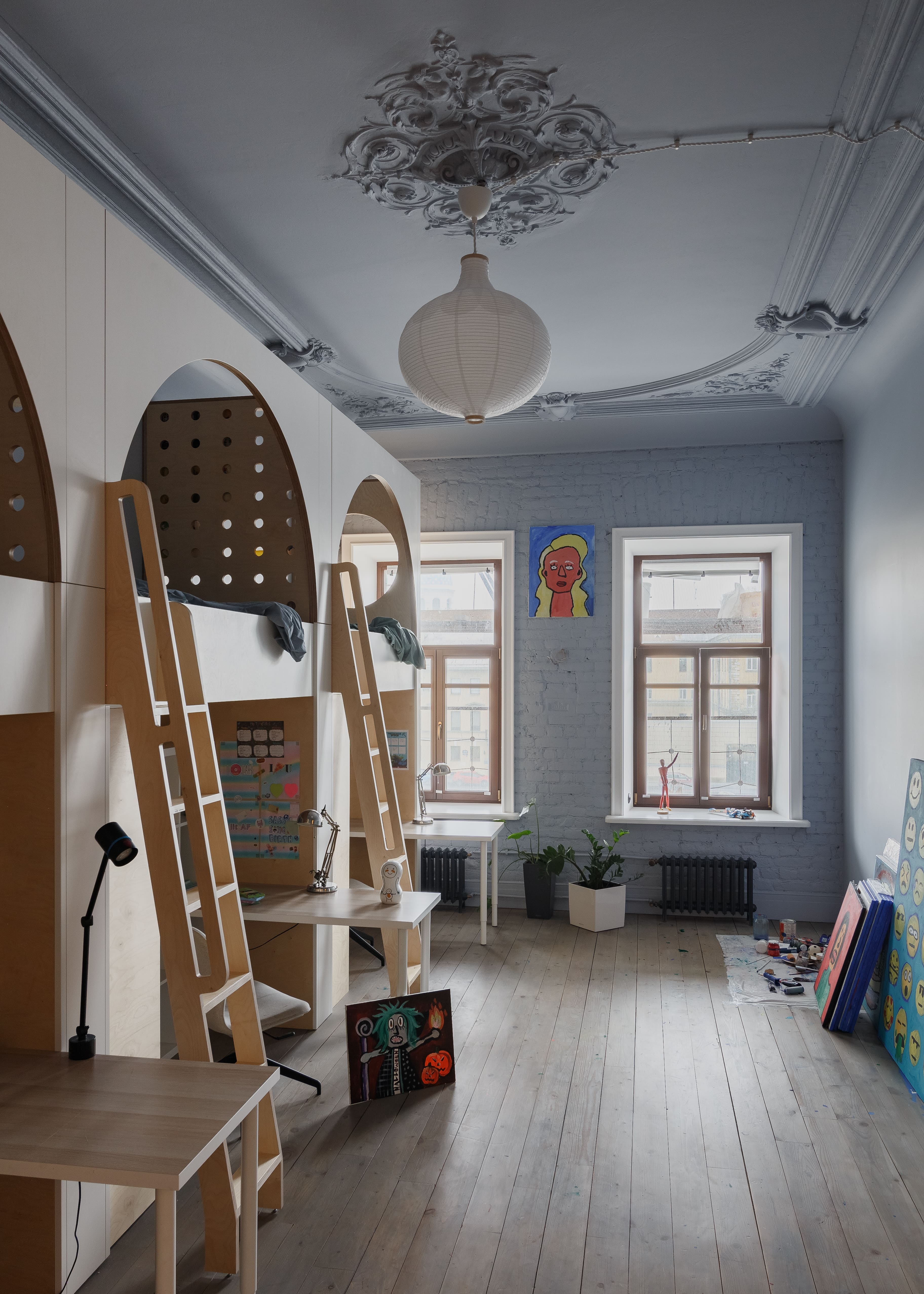 У нас уже были удобные и практичные столы, стеллажи из ИКЕА, которые мы интегрировали в интерьер. В концепции мы предусмотрели абсолютно все: и свободное пространство, и необходимые многофункциональные зоны для каждого - три рабочих места. Каждое место включает в себя письменный стол, оборудованный освещением, удобное рабочее кресло, стеллаж и шкаф для одежды. Каждое из трех спальных мест включает постель 90х200 см, личную библиотеку, освещение, место под зарядки. Вдохновением для детской послужили Никольские ряды, которые находятся на соседней улице. Это длинные галереи, дворы и высокие арки, создающие эффект простора и полета мысли.